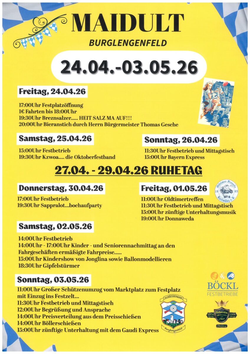 Zum Abschluss der Maidult feiert der Schützengau Burglengenfeld am 3. Mai 2026 sein 75-jähriges Bestehen. Der Gau vereint zahlreiche Schützenvereine aus der Region und prägt seit Jahrzehnten das sportliche und gesellschaftliche Leben vor Ort. Mit dem Jubiläum rückt er die lange Tradition des Schützenwesens in den Mittelpunkt und würdigt das ehrenamtliche Engagement in den Vereinen. Vertreterinnen und Vertreter der Mitgliedsvereine sowie Gäste aus Politik und Öffentlichkeit kommen zusammen, um dieses besondere Jubiläum gemeinsam zu feiern und die Bedeutung des Schützengaus für die Region hervorzuheben.