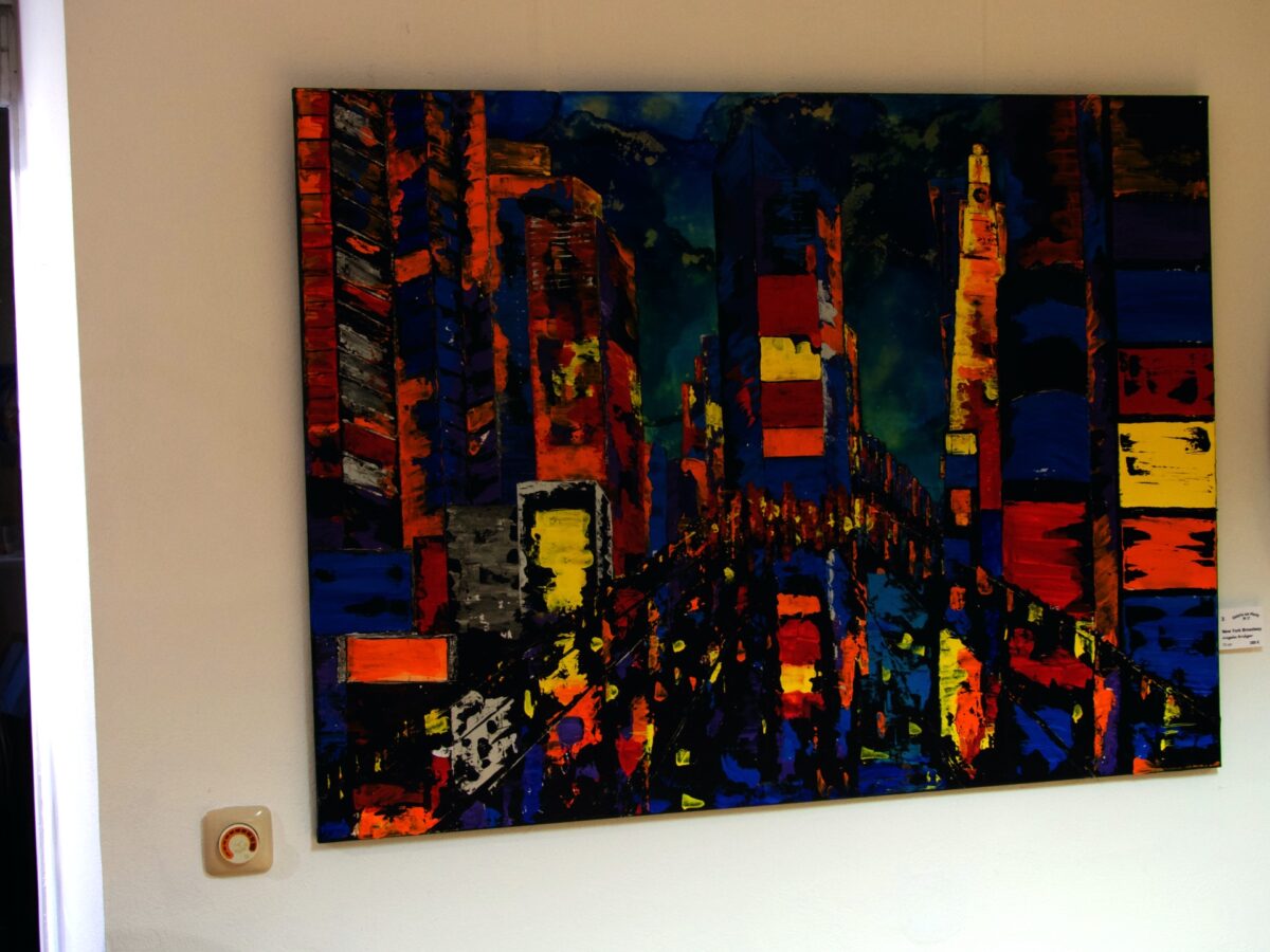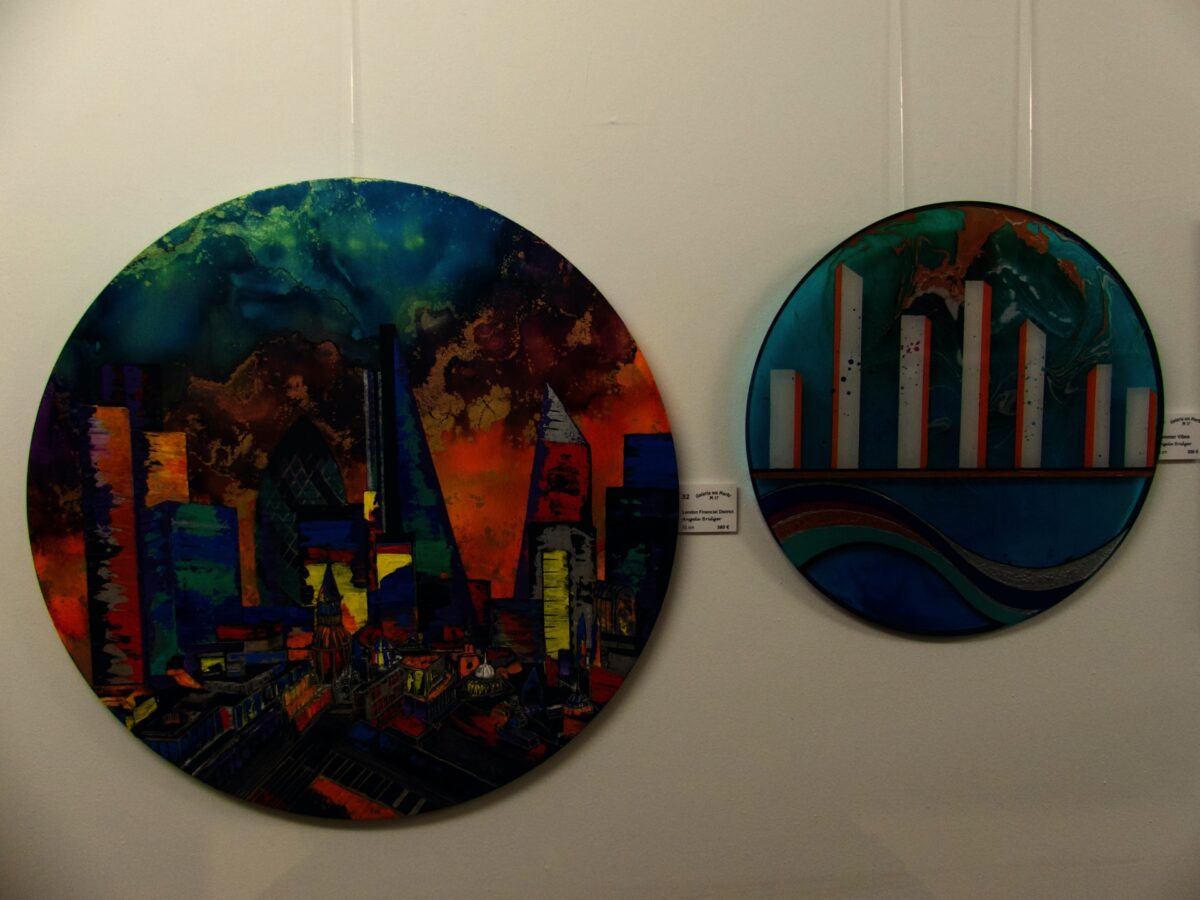 Und diese Brücken beschränken sich nicht nur auf die verwendeten Techniken und Materialien. Beispielsweise malt Bridger gerne auf runden Grundplatten. Wenn es dann, wie bei ihrer Serie “New York Broadway”, ein rechteckiges Zwillingsbild gibt, entsteht eine Dynamik, die nur schwer zu reproduzieren ist. Gesteigert werden diese Effekte bei ihren Resin-Art-Werken, bei denen die gebürtige Regensburgerin verschiedenartige Materialien verwendet.