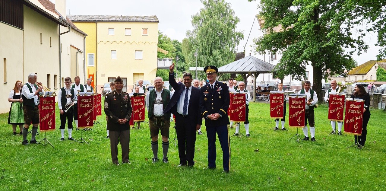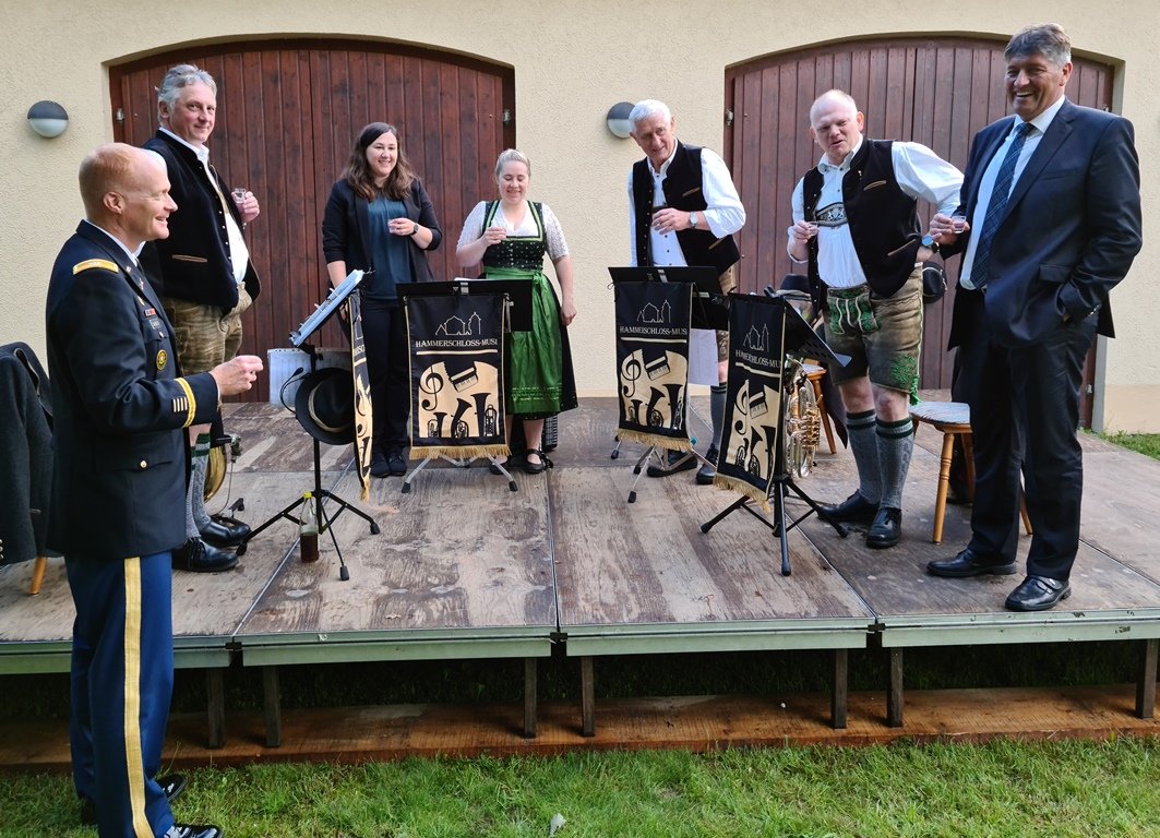 Knobloch hatte noch einige Überraschungen für seine amerikanischen Freunde parat: Bereits 2019 hat Kulturmanagerin Birgit Plößner mit Komponisten Franz Gerstbein den Konzermarsch “Durch alle Zeiten – Through all times” erarbeitet und nur noch auf eine Gelegenheit zur Überreichung gewartet. Dieser soll sowohl von der USAREUR-Band als auch von hiesigen Blaskapellen bei künftigen Ereignissen gespielt werden. Die Musikkapelle Dießfurt spielte ihn gleich erstmalig öffentlich vor.