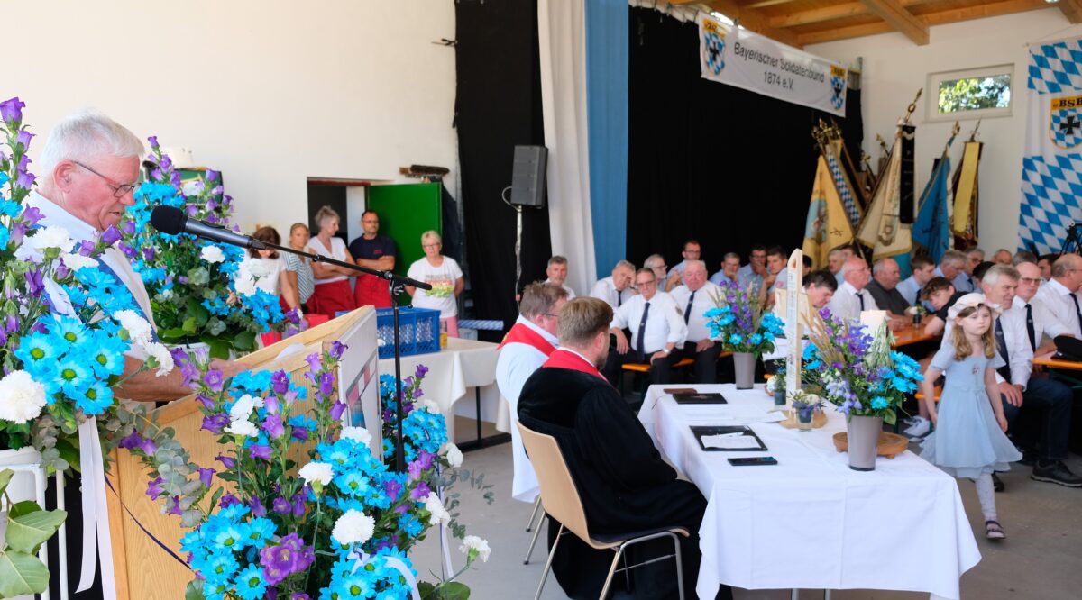 Selig sind die Friedensstifter, zitierte Pfarrer Hannes Kühn aus dem Matthäusevangelium, um mit dieser Feststellung auch die Erinnerungskultur der Soldatenkameradschaft zu würdigen. Frieden stiften und die Gemeinschaft fördern. Beide Aufgabenstellungen seien beim Speichersdorfer Soldaten- und Kameradschaftsverein in einer Zeit des unpersönlichen Online Austausches durch persönliche Begegnungen in guten Händen. „Freut euch und jubelt“! Diese goldene Regel, ebenfalls aus dem Matthäusevangelium, bestimmte anschließend den fröhlichen Gemeinschaftsabend, zu dem Vorsitzender Edmund Bruckner nach einem kurzen Rückblick auf die Gründerjahre des Vereins viele hundert Gäste begrüßte. Unter ihnen Schirmherr Christian Porsch, Altbürgermeister Manfred Porsch, Landrat Florian Wiedemann und Bundes-, Landes- und Kommunalpolitiker. „Freuen wir uns gemeinsam, dass es noch Kameraden gibt, die mit Stolz Traditionen aufrechterhalten und dem Frieden dienen. Wir brauchen diejenigen, die dieses Andenken weiter tragen“!