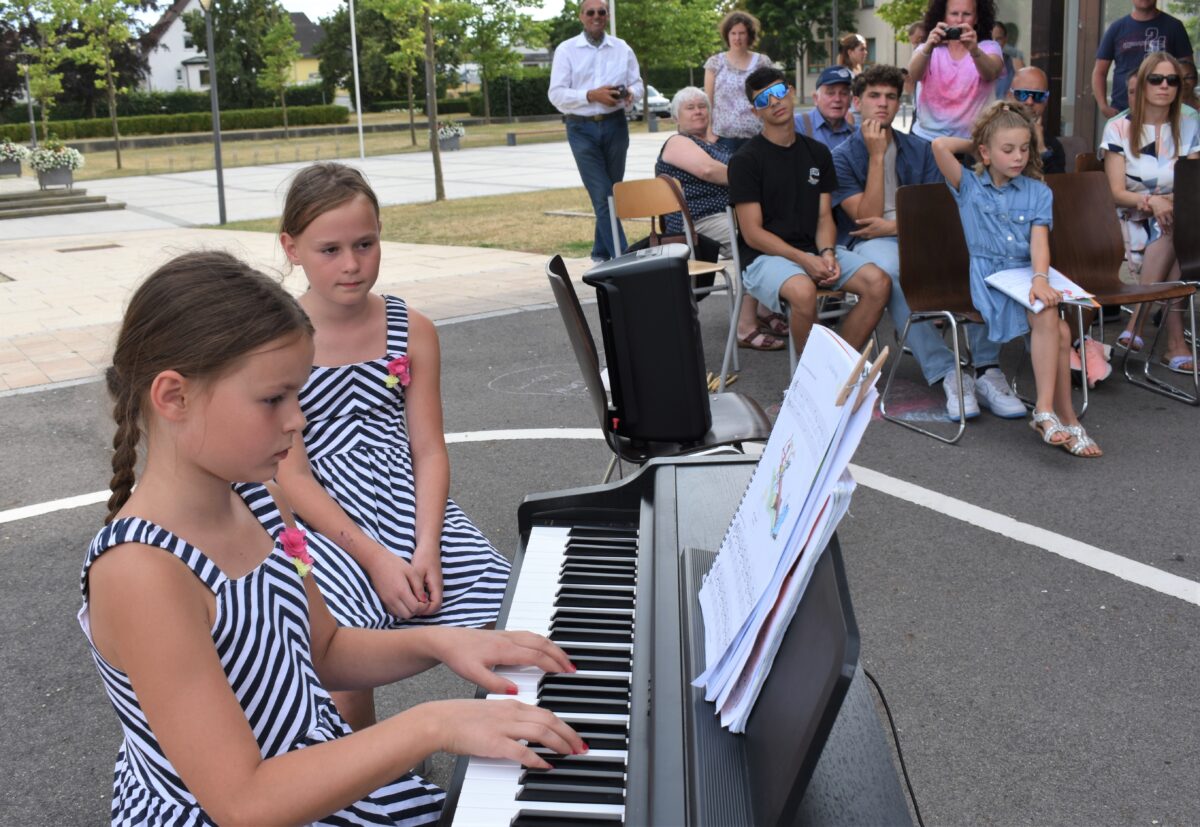 Bei nicht zu hohen Temperaturen auf dem Schulhof-Gelände zeigten die Schüler und Schülerinnen des Musikvereins “Klingende Töne”, was sie im abgelaufenen Jahr alles gelernt haben. Die Kleinsten von der “Musikalischen Früherziehung” gingen mit Ausbilderin Lilia Gette “zum Melken auf den Bauernhof”.