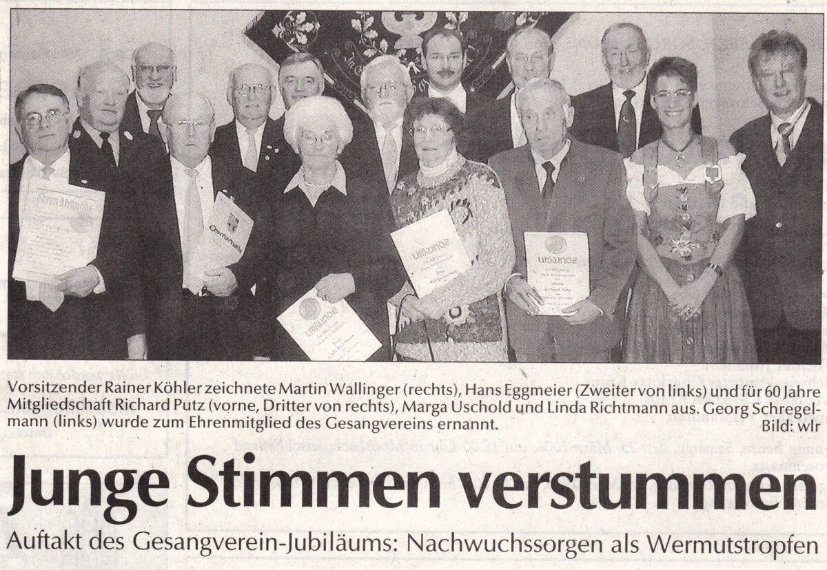 Um ein besonderes Geschenk für den Gesangverein bemühte sich zum 100- jährigen Jubiläum der damalige Vorsitzende Rainer Köhler, indem er für den Chor die Zelter-Plakette der Arbeitsgemeinschaft Deutscher Chorverbände e.V. beantragte. Diese besondere Auszeichnung wurde am 2. April 2006 in Grünwald bei München durch Minister Thomas Goppel überreicht.