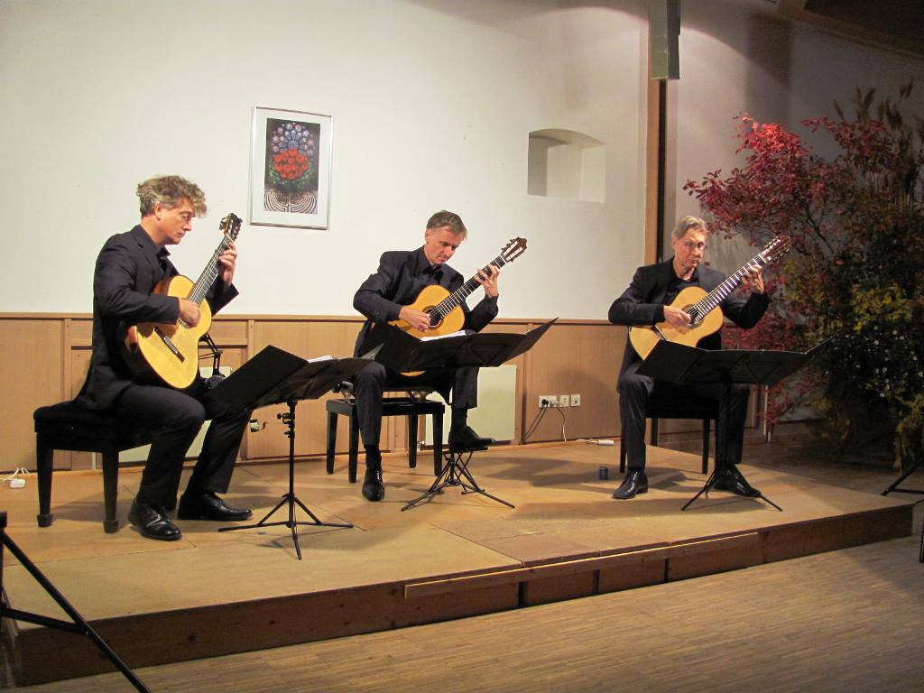 Das Trio der geradezu perfekten Saitenvirtuosen präsentierte ein außergewöhnlich neues Hörerlebnis auf dreimal sechs Saiten, als konzertierte ein ganzes Orchester, wie etwa bei Vivaldi, bei dem eine Gitarre das Solo übernahm und die beiden anderen die Begleitung. Dabei schufen sie mit intensivster Instrumentenbeherrschung eine Atmosphäre hoher Intensität. Sie kommunizierten mit den Augen, harmonierten mit den Fingern und ließen die Saiten in rhythmisch genialer Übereinstimmung tanzen. Diese dichte Stimmungslage der musikalischen Hoch-Saiten-Tänzer gelang auch durch die konzentrierte Bereitschaft der zahlreichen Zuhörer, sich von der perfekten Dreisamkeit der Gitarristen anstecken zu lassen.