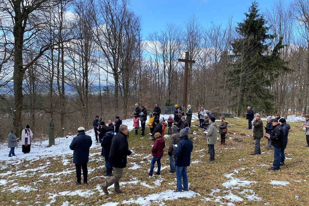 Pfarrer Norbert Götz führte am vergangenen Sonntagnachmittag die Gläubigen auf dem Fahrenberg entlang des Kreuzwegs. Angefangen von der Dreifaltigkeitskapelle führte der Weg über die Kreuzwegstationen am Freialtar vorbei zur Wallfahrtskirche Mariä Heimsuchung.