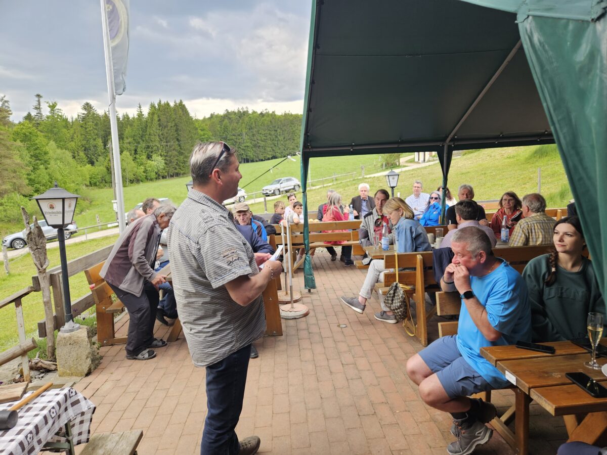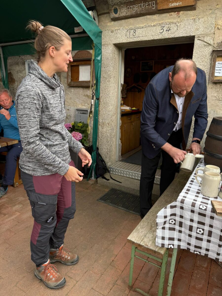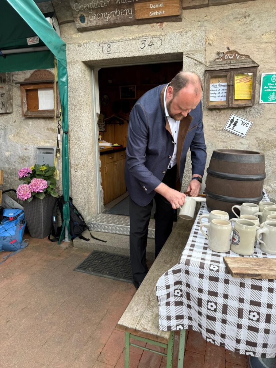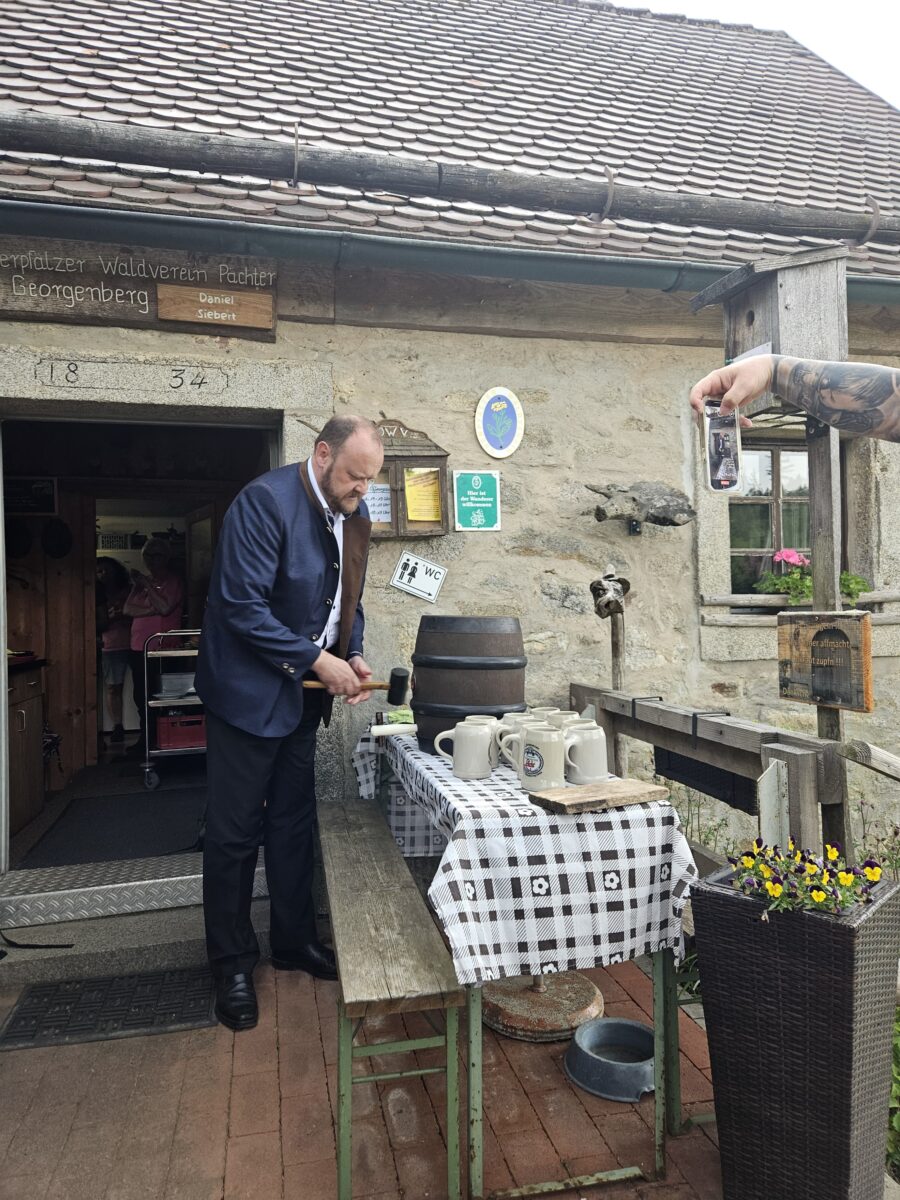 Am Zielort, der Alten Mühle Gehenhammer, fand der Festakt zur offiziellen Einweihung des zertifizierten Glasschleifererweges statt. Zum Anstoßen stifteten die Bürgermeister Anton Kappl und Reiner Gäbl Rebhuhn-Zoigl des Kommunbrauhauses Eslarn und Leuchtenberger Sekt. Landrat Andreas Meier lobte in seiner Ansprache den Qualitätswanderweg und die Arbeit der örtlichen OWVs. Er unterstrich die heutige Erwartungshaltung der Menschen an Qualität und das Erfordernis, genau darauf den Fokus zu legen. Er erfreute die Anwesenden durch das erfolgreiche Anstechen des Fasses. Weiterhin dankte Bürgermeister Rainer Rewitzer aus Pleystein allen, die zur Zertifizierung des Weges beigetragen hatten.