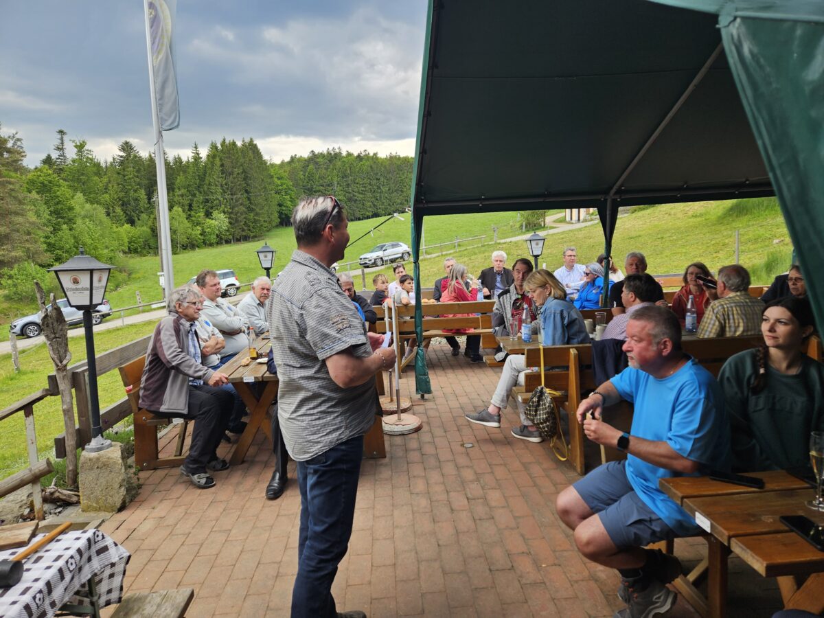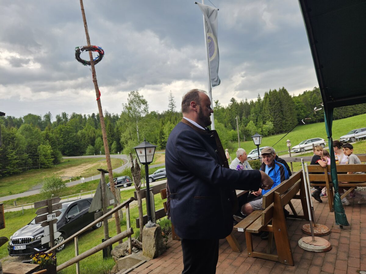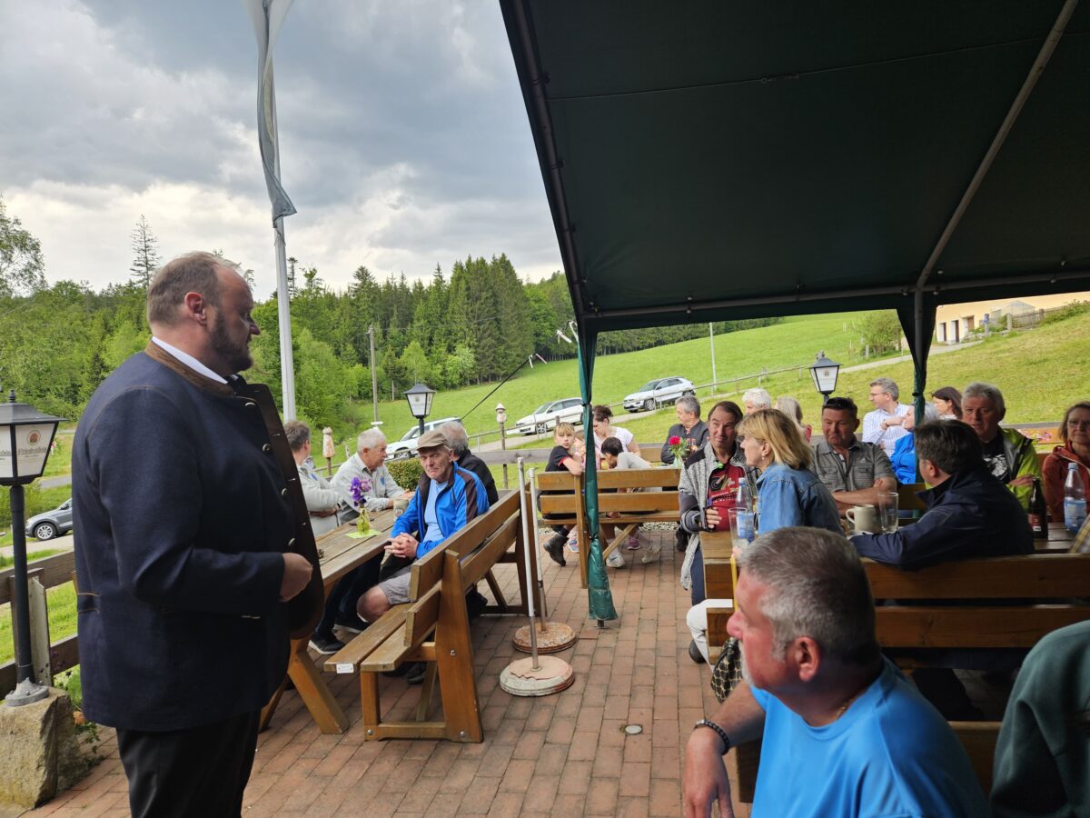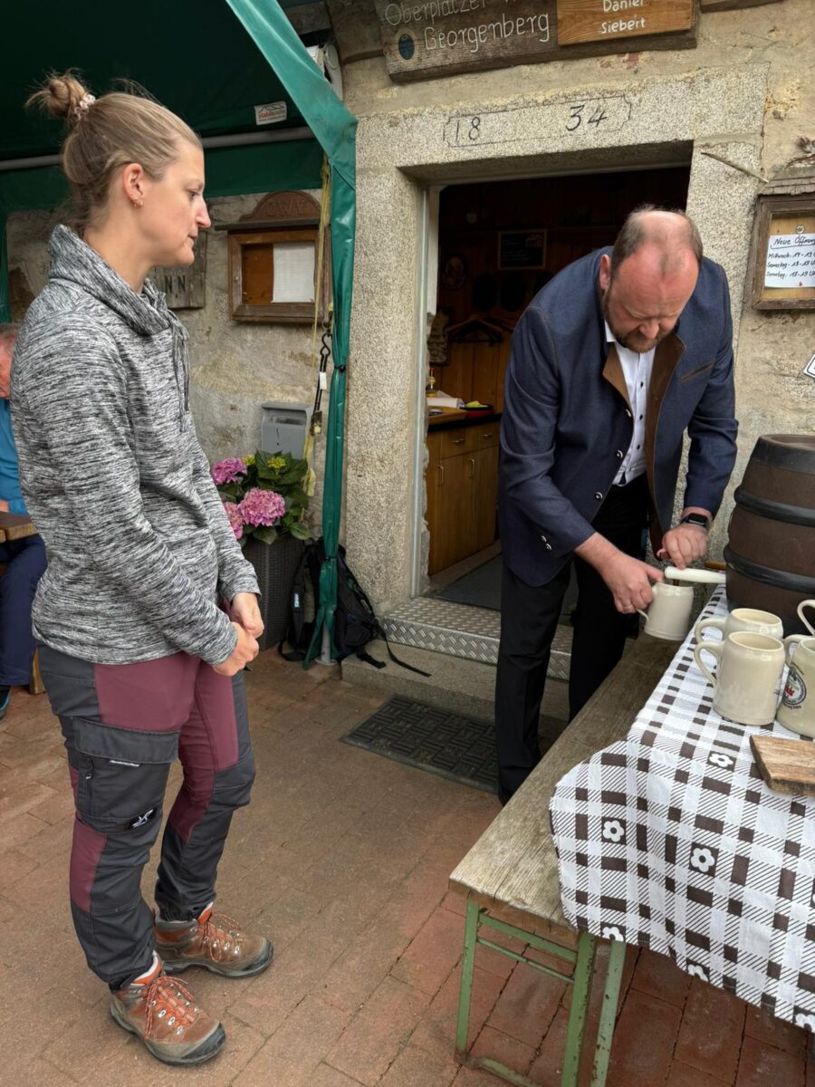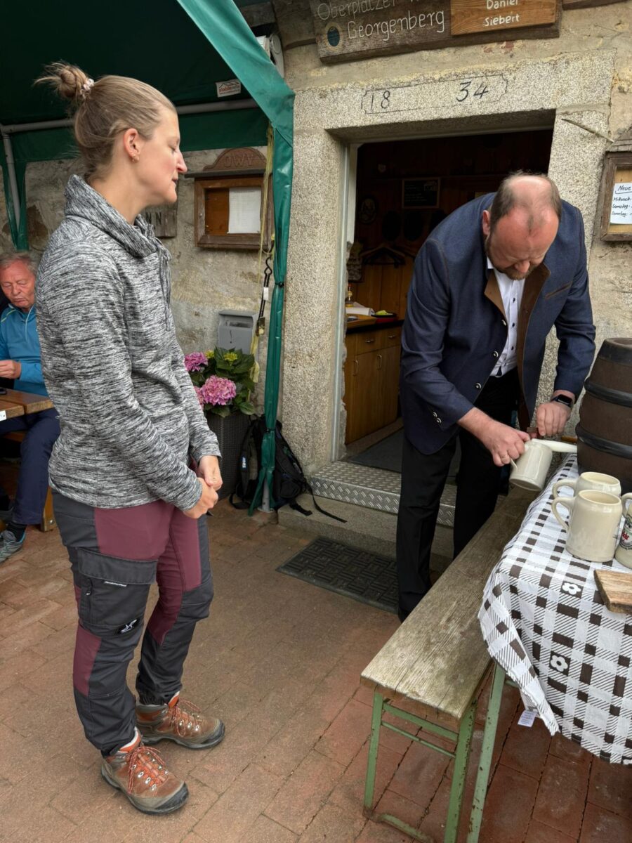 Am Zielort, der Alten Mühle Gehenhammer, fand der Festakt zur offiziellen Einweihung des zertifizierten Glasschleifererweges statt. Zum Anstoßen stifteten die Bürgermeister Anton Kappl und Reiner Gäbl Rebhuhn-Zoigl des Kommunbrauhauses Eslarn und Leuchtenberger Sekt. Landrat Andreas Meier lobte in seiner Ansprache den Qualitätswanderweg und die Arbeit der örtlichen OWVs. Er unterstrich die heutige Erwartungshaltung der Menschen an Qualität und das Erfordernis, genau darauf den Fokus zu legen. Er erfreute die Anwesenden durch das erfolgreiche Anstechen des Fasses. Weiterhin dankte Bürgermeister Rainer Rewitzer aus Pleystein allen, die zur Zertifizierung des Weges beigetragen hatten.