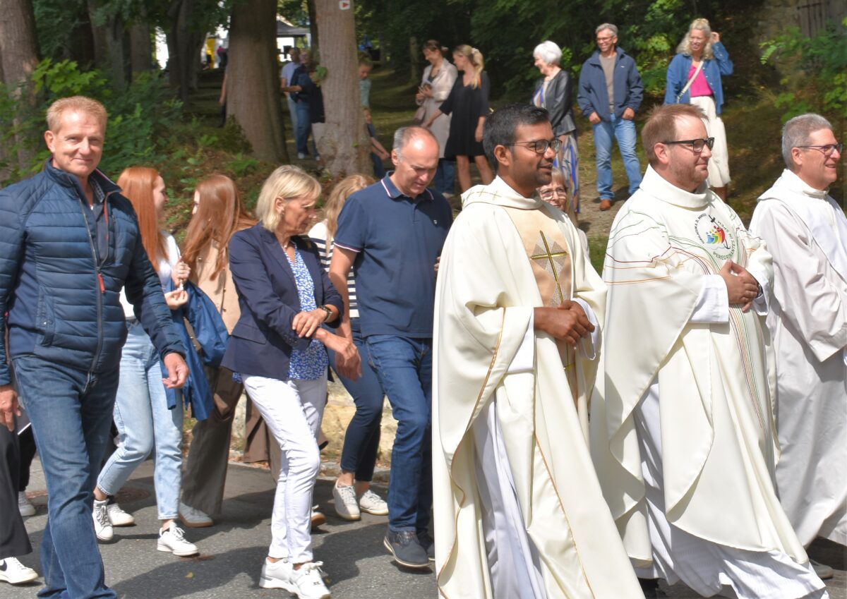 Viele Gläubige feierten den Gottesdienst am Annaberg vor der Maria-Hilf-Kirche unter freiem Himmel mit. “Die Wetter-Apps sagen alle was anderes. Aber wir hoffen, dass der Himmel dicht hält”, meinte Pfarrer Daniel Fenk, der zusammen mit Kaplan Raveendra Reddy Ponnapati und Ruhestandspfarrer Hans Bayer sowie Roberto Natali aus Grafenwörth (Niederösterreich), der zum 30-jährigen Jubiläum der Städtepartnerschaft mitfeierte.