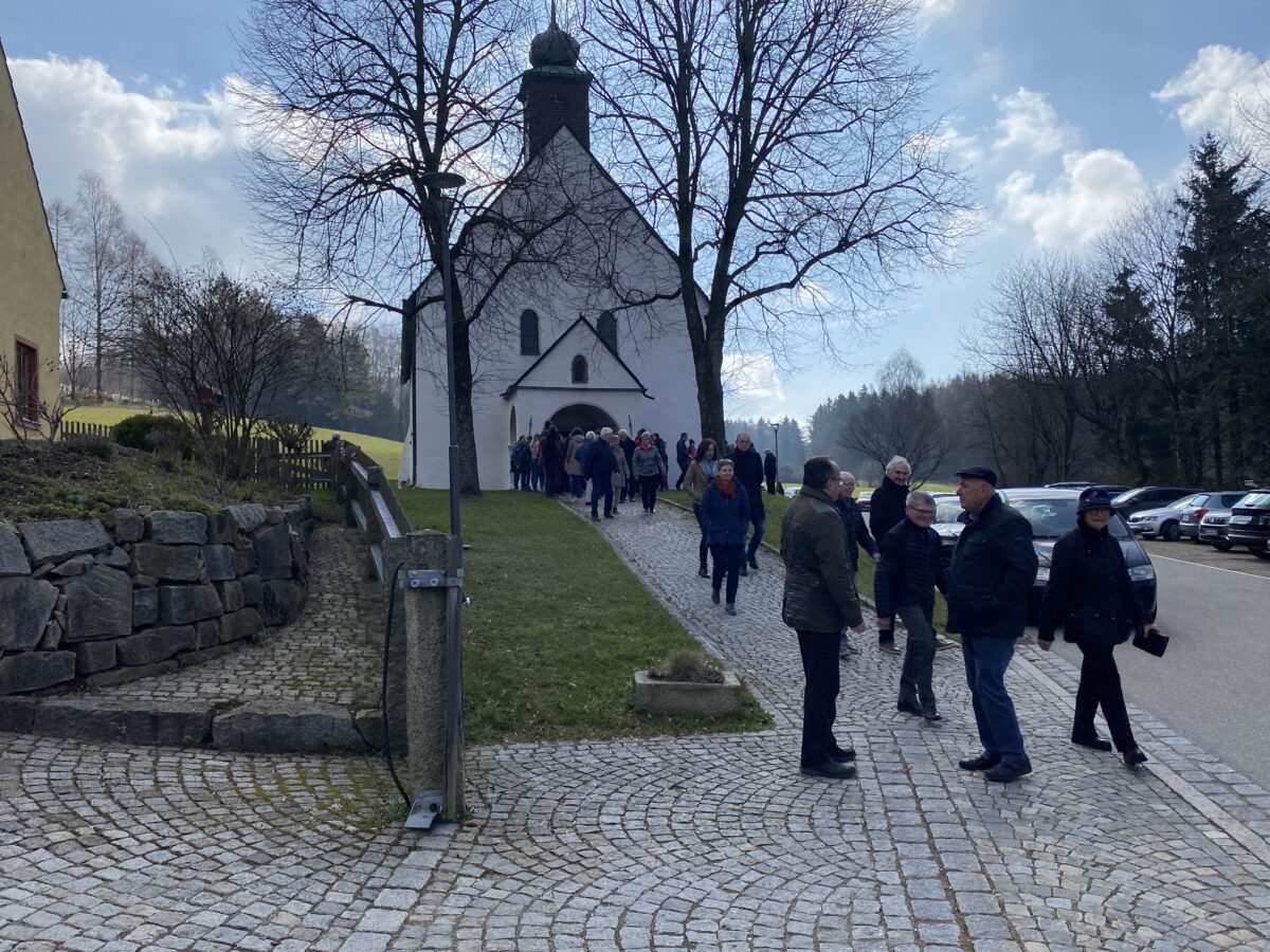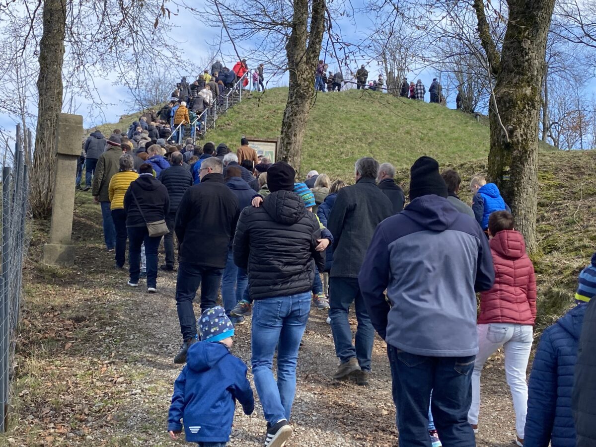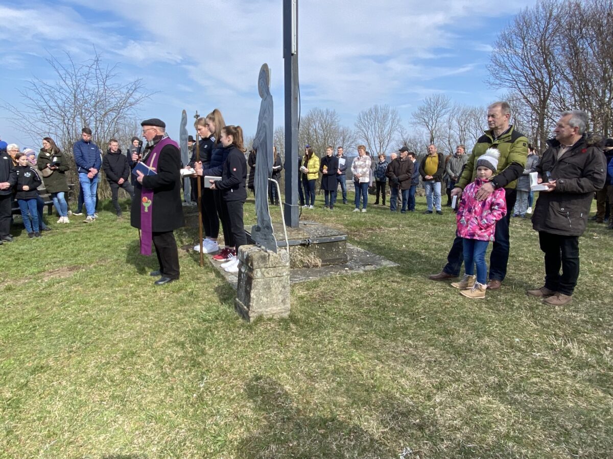 Der Kreuzweg an Karfreitag, den Schoßberg hinauf, ist schon lange Tradition. Bei angenehmen Temperaturen ließen es sich rund zweihundert Gläubige -vom sechs Monate alten Johannes im Wickeltuch der Mama bis zum zweiundneunzigjährigen Max- nicht nehmen, den steilen Weg betend und singend hinaufzuziehen. Eine gute Kondition bewiesen die Vorbeter Hans Maier und Richard Zimmet, die abwechselnd die Stationen vortrugen. Am Gipfelkreuz angekommen, erteilte Pfarrer Wilhelm Bauer noch den Segen.