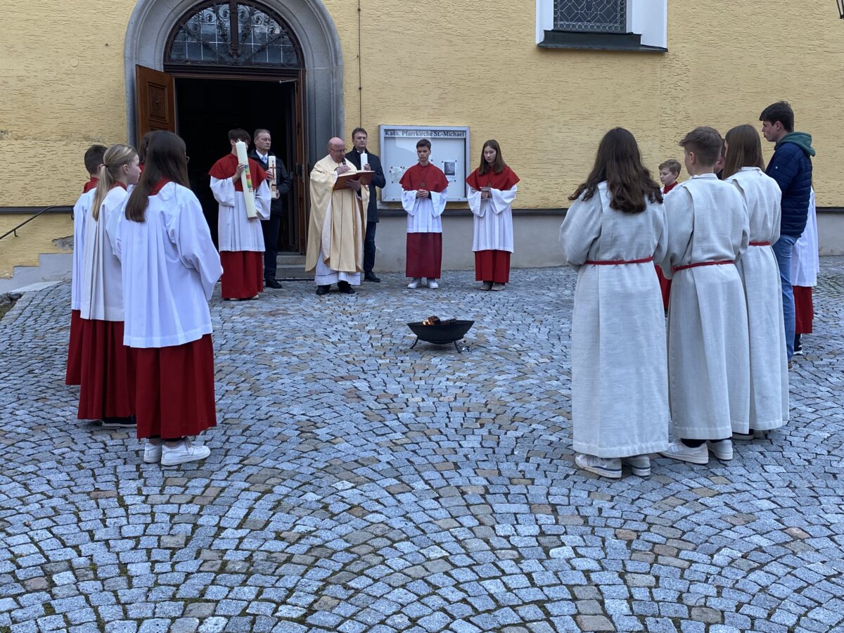 Die Feier der hochheiligen Osternacht, die den Durchgang durch den Tod zum Leben sakramental nachvollzieht, ist der Höhepunkt der drei österlichen Tage vom Leiden, vom Tod und von der Auferstehung des Herrn. Nach Segnung des Osterfeuers außerhalb der Kirche, Bereitung und Entzündung der Osterkerze und Einzug mit der Osterkerze unter dem dreimaligen Ruf „Lumen Christi“ in die dunkle Kirche, wurde allen Gläubigen das Licht der Osterkerze gereicht. Beim Gloria läuteten alle Glocken und die Orgel erklang wieder. Dabei wurden die Altarkerzen entzündet. Nach der Taufwasserweihe erneuerten die Gläubigen ihr Taufversprechen und wurden mit dem soeben geweihten Taufwasser besprengt. Die anschließende feierliche Eucharistiefeier wurde vom Kirchenchor mit der Fortsetzung der „Greimhartinger Messe“ umrahmt. Siebzehn Ministrantinnen und Ministranten leisteten ihren Dienst zur würdigen Gestaltung der Liturgie. Der dekorative Blumenschmuck wurde unter der Leitung von Mesnerin Hildegard Licha gestaltet.