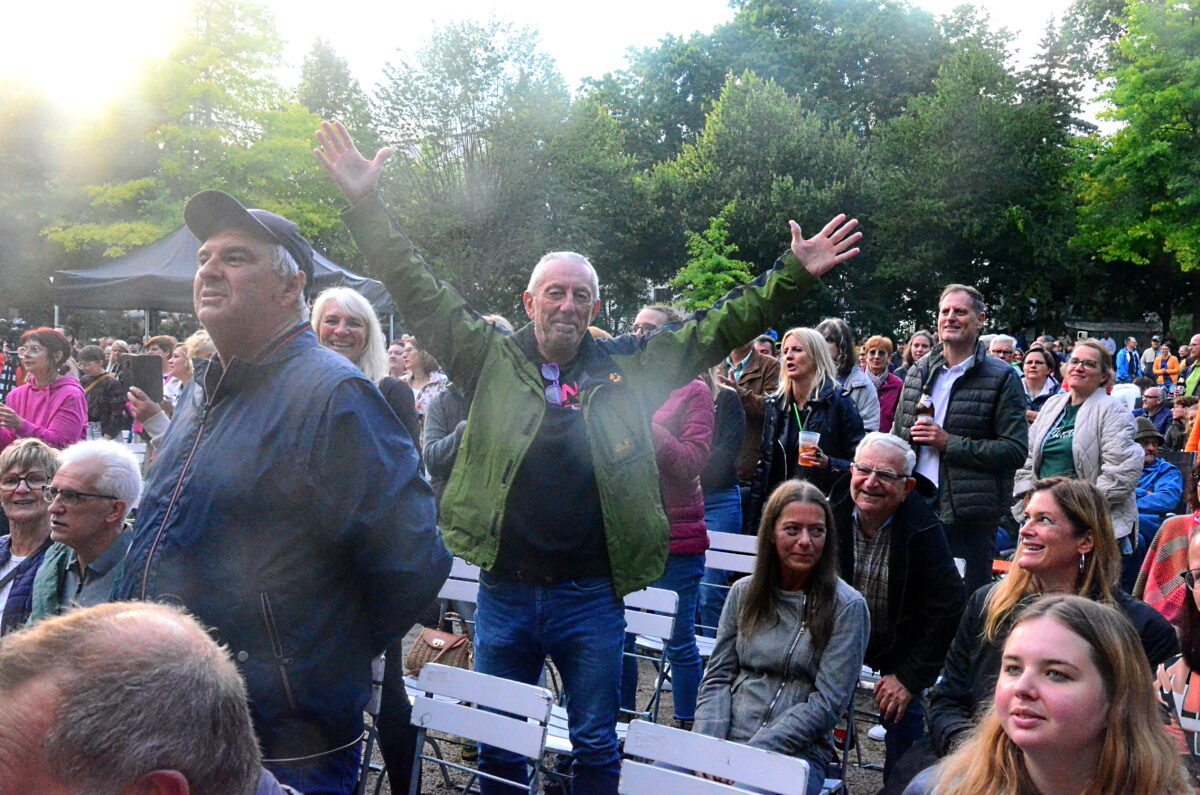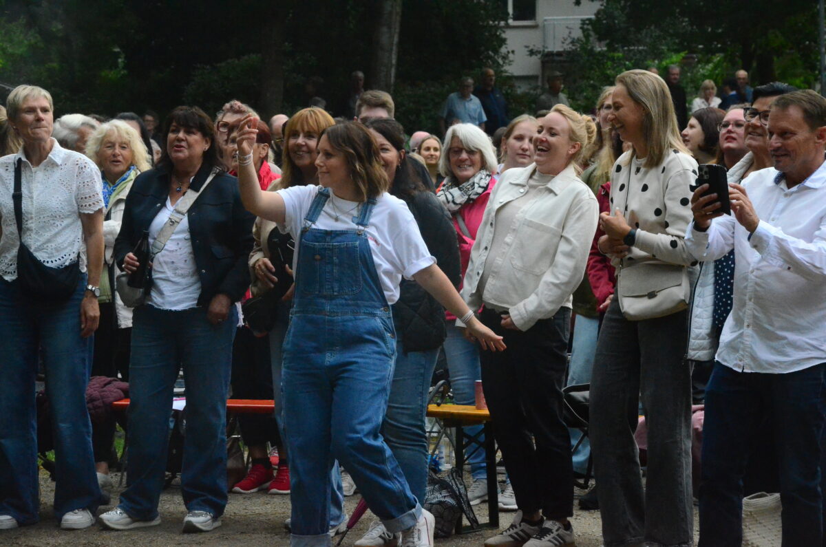 Das Format war einzigartig. Das Publikum wünschte sich Songs, Gwasch spielte sie dann – in der Mehrzahl waren es deutschsprachige Gassenhauer – live und der ganze Park sang mit. Wer nicht textsicher war, konnte mitlesen, wie beim Karaoke. Leider waren die Lautsprecher so aufgestellt, dass die Leute hinten und an den Rändern Schwierigkeiten beim Zuhören hatten. Vor der Partybühne war allerdings die Hölle los. Dort gab’s eine Mordsgaudi. Die Stimmung schaukelte sich hoch. Vor allem: Man musste keine Sopranistin, musste kein Tenor sein. Mitgrölen zu können reichte völlig. Nur laut genug musste man sein. Am besten noch viel lauter als Rampensau Franzi und Jens, ihr Alleskönner.