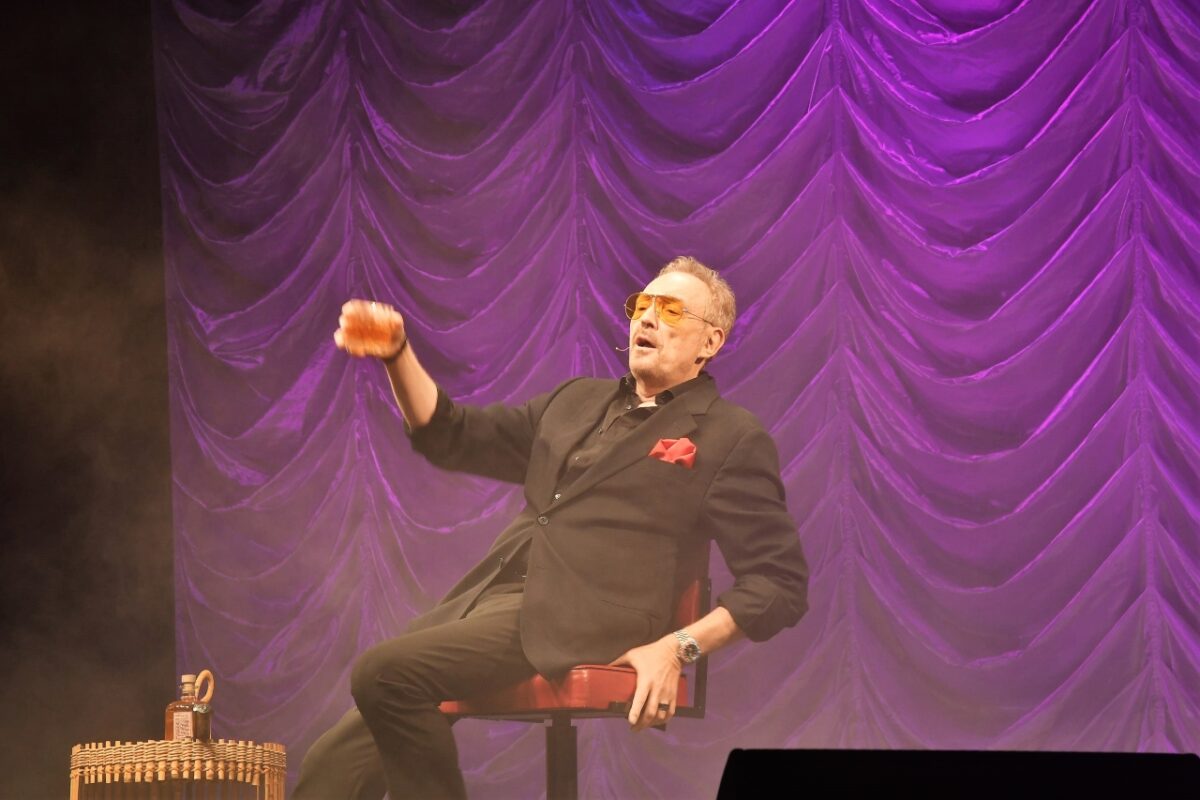 Im zweiten Teil sitzt Hader bequem mit einem Rum Glas auf der Bühne und sinniert über sich und das Leben. Teilweise recht abgefahren im Vergleich zum ersten Durchgang, denn er nimmt kein Blatt vor den Mund. „Zur Darmspiegelung fahr ich jugendlich im Kapuzenpullover“ Er ist er ja auch ein begnadeter Schauspieler, der sich in allen Facetten in dieser weiteren Stunde präsentiert. Manchmal bleibt einem der Lacher im Hals stecken. Hader ist nun mal Hader. Da weiß man, was man erwarten darf. Er hat etwas von Helmut Qualtinger der ewige Nörgler, der das Glas immer halbleer sah und den Schöngeistern die Maske vom Gesicht riss. Hader zu erleben ist so wie man in den Abgrund des Alters blickt, hintergründig und mit Tiefgang. Einfach gute Unterhaltung auf hohem Niveau. Gerne treffen wir wieder auf Hader und seine Sicht des Lebens.