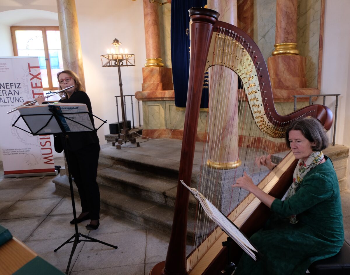 Eine Besonderheit: Erstmals hörte man in der seit 1815 bestehenden Synagoge Harfenklänge vom Feinsten, dargeboten und gespielt von Veronika Miller-Wabra aus Oberviechtach. Sie spielt die Harfe von Kindesbeinen an, weil sie sich damals in dieses Instrument verliebt hatte. Ihr Wissen und Können gibt sie heute als Musiklehrerin an den Musikschulen in Regensburg, Schwandorf und Neunburg vorm Wald an Kinder und Erwachsene weiter. Mit Flötistin Beate Althammer hat sie eine treue Gefährtin mit nach Floß gebracht.