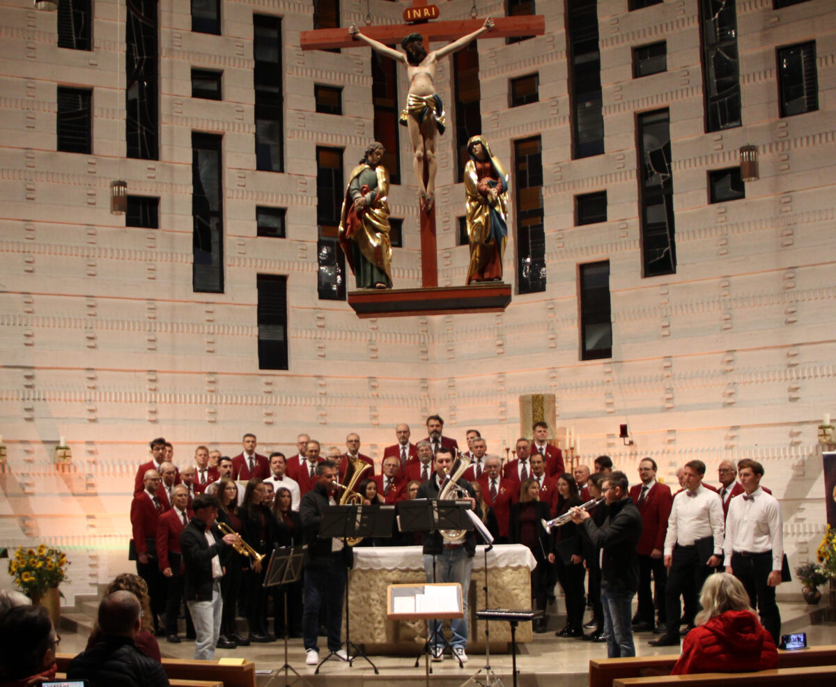 Im Altarraum fanden Chor und Bläser ihren Platz. Die Bläser vor dem Altar, der Chor dahinter – eine harmonische Anordnung, die optisch und akustisch beeindruckte. Das Konzert, das fast 120 Minuten dauerte, war in verschiedenen Abschnitten gegliedert. Sowohl die beiden Chöre, als auch die Bläser traten jeweils mit eigenen Stücken auf, bevor sie in gemeinsamen Darbietungen musikalisch verschmolzen. Dabei reichte das Repertoire von Klassikern, Balladen bis hin zu festlicher Bläsermusik.