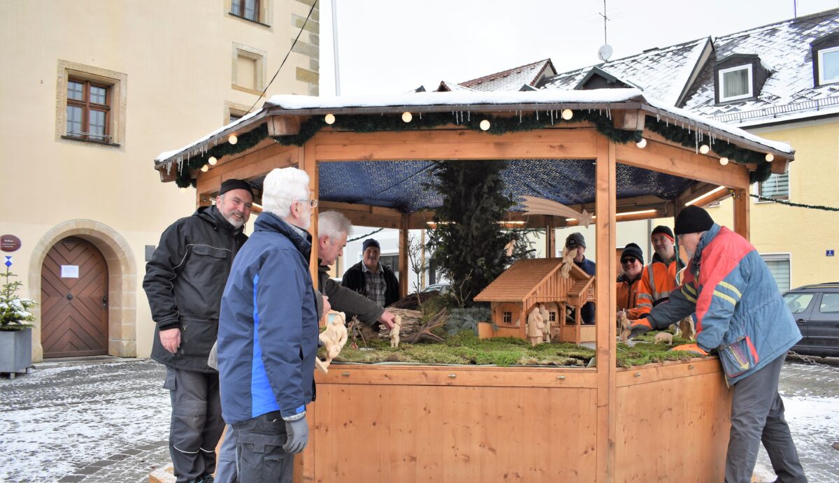 Am Donnerstag stellte eine Gruppe der Schnitzergemeinschaft Grafenwöhr wieder die beliebte Weihnachtskrippe beim Rathaus auf. Fast den ganzen Vormittag dauerte es, bis die Krippe samt der rund 150 Figuren stand. „Es gibt zwei Varianten der Weihnachtskrippe: Orientalisch und Bayrisch; Letzteres ist heuer der Fall“, erklärt Reinhold Gietl, der Sprecher der Schnitzergemeinschaft. Mit viel Liebe zum Detail entstanden auch einige neue Figuren. – Außer den acht neuen Hirten sind dies Josef und Maria, deren Haare ein geflochtener Kranz ziert.