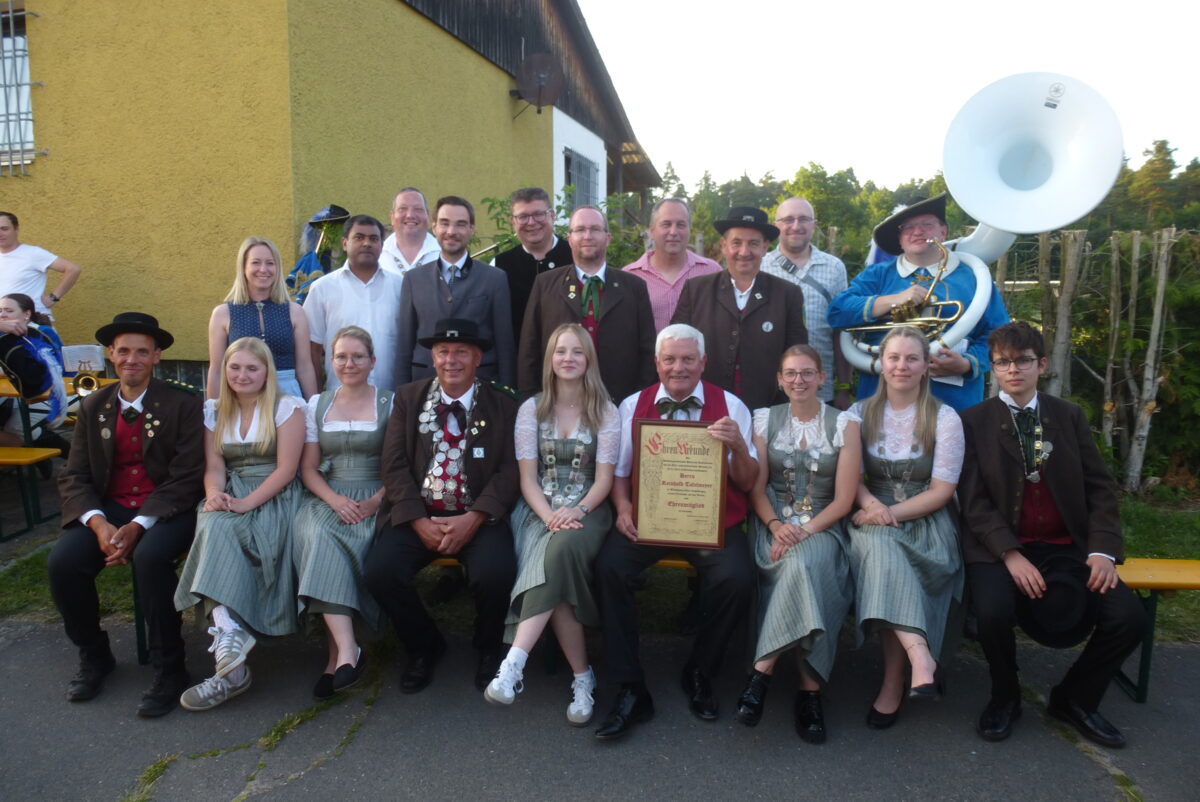 In seiner Laudatio würdigte Sportleiter Klaus Ludwig die Verdienste von Reinhold Tafelmeyer. Dieser war in seiner nahezu 60-jährigen Zugehörigkeit 34 Jahre Schriftführer, ferner Waffenwart, Jugendleiter, Kassier und erfolgreicher Schütze. Die Ernennung zum Ehrenmitglied ist nicht nur Ausdruck der Wertschätzung, sondern auch Respektbekundung vor dem Mut und Tatendrang. Diese Charaktereigenschaft macht dich zum Vorbild für die ganze Schützengesellschaft „Hubertus“, betonte Ludwig bei der Überreichung der Ehrenurkunde. Tafelmeyer dirigierte anschließend den Marsch „Glück auf“. In der windstillen Sommernacht ließ sich die Hälfte der Gäste im Freien nieder. Der Barbetrieb, dem DJ Project M. u. D musikalisch einheizte, endete erst um 4 Uhr.