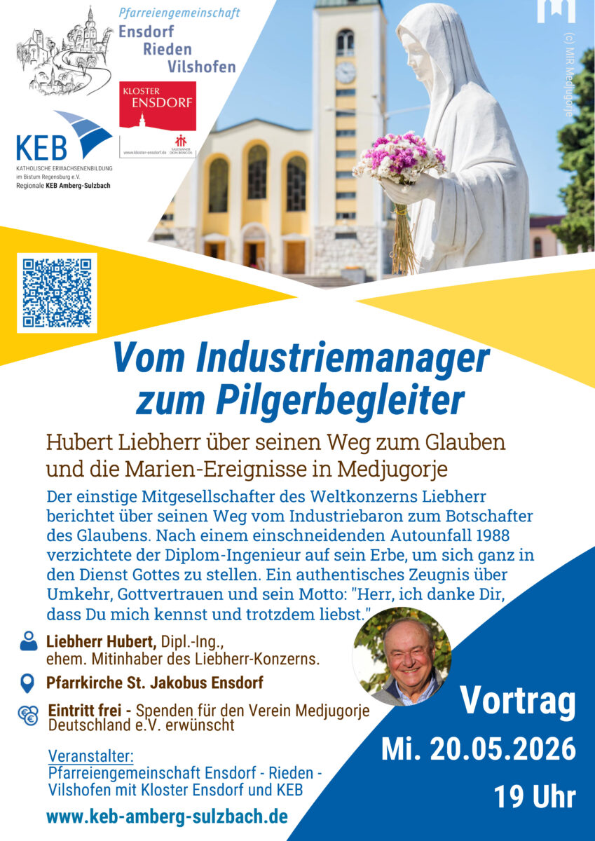 Am Mittwoch, den 20. Mai 2026, berichtet der ehemalige Liebherr-Mitinhaber Hubert Liebherr in seinem Vortrag „Vom Industriemanager zum Pilgerbegleiter“ in der Pfarrkirche St. Jakobus in Ensdorf über seine radikale Lebenswende. Nach einem einschneidenden Autounfall verzichtete der einstige Industriebaron auf sein Erbe, um sein Leben ganz in den Dienst Gottes und der Botschaft von Medjugorje zu stellen. In seinem authentischen Zeugnis schildert der Diplom-Ingenieur ab 19 Uhr seinen Weg vom Weltkonzern hin zur karitativen Arbeit und zur Organisation von Wallfahrten.