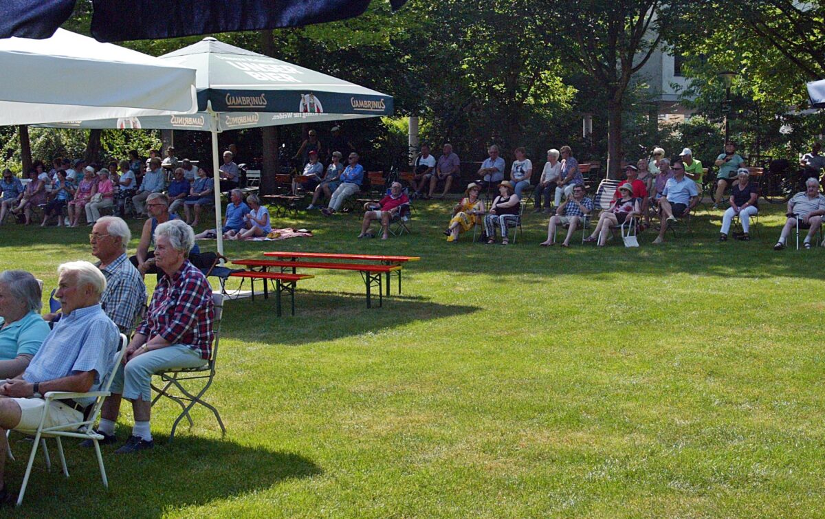 Wenn es zu Hause zu heiß wird, kann man die Jalousie herunterlassen, das tat das Orchester auch sinnbildlich mit dem Tango „Jalousie“ von Jacob Gade. Dieser Tango lockte auch ein Pärchen barfuß im Gras zu tanzen. Nach einer Pause kam selbst im Freien Wohnzimmeratmosphäre auf. „Wochenend und Sonnenschein“ und der „Schöne Gigolo“ hier setzten die vier Musiker bei Walzer, Tango und jazzigen Evergreens Höhepunkte.