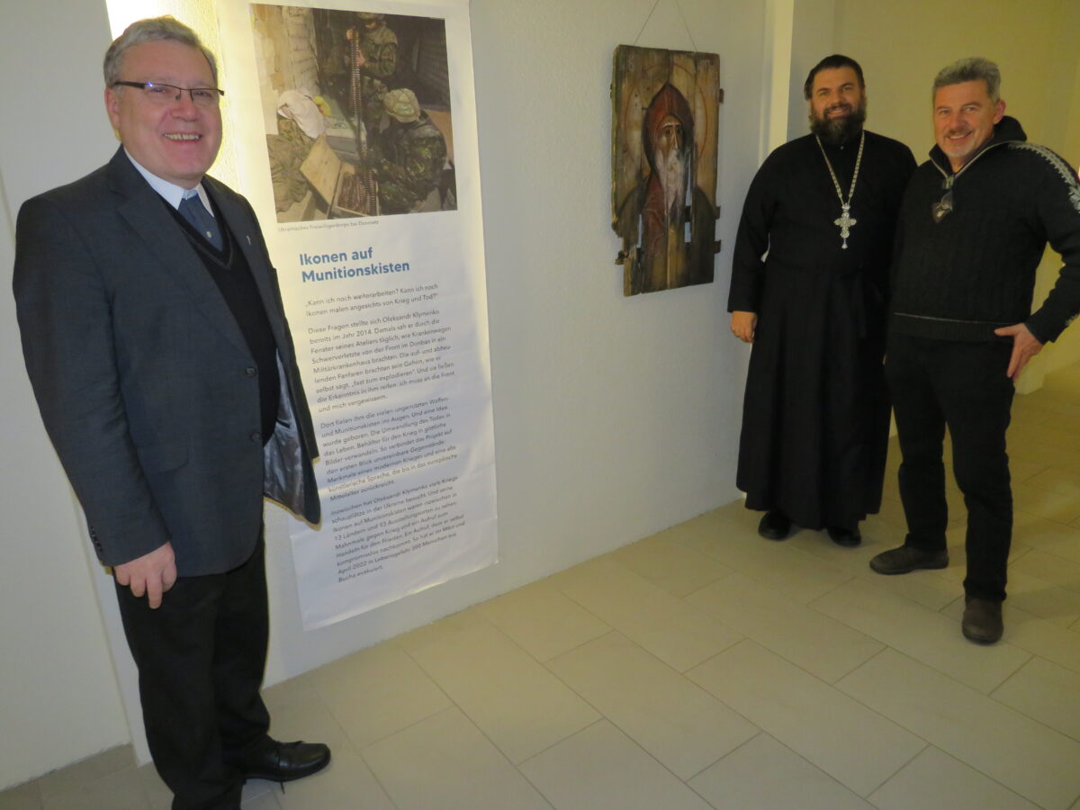 Mit einem Vortag führte Dr. Robert Rapljenovic vom Collegium Orientale aus Eichstätt die Besucher zur Ausstellungseröffnung “Ikonen gegen den Krieg -Kunst auf Munitionskisten” am Samstag in das Thema ein. Gemeinsam mit dem Haus Johannisthal zeigt die Ausstellung im ganzen Advent die Werke von Sofia Atlantova und Oleksandr Klymenko.
