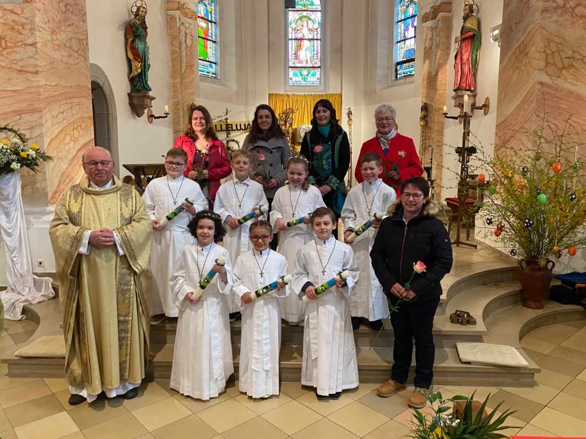 Bäuml, Antonia Schärtl, Hannah Schönberger, Julius Bartmann, Simon Götz, Moritz Reichelt und Michael Schmucker – in der Pfarrkirche „St. Michael“ ihre Erste Heilige Kommunion. Der Einzug vom Pfarrhof zur Kirche musste witterungsbedingt abgesagt werden. Doch der “Ausweicheinzug” vom Hintereingang der Kirche zum Altar war genauso feierlich. Musikalisch begleitet wurde er von Rudi Schneider an der Orgel und Daniel Eger mit der Trompete.