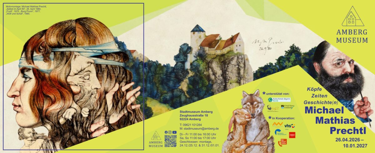 Köpfe. Zeiten. Geschichte(n). Michael Mathias Prechtl zum 100. Geburtstag. 26. April 2026 bis 10. Januar 2027 im Stadtmuseum Amberg. Der in Amberg geborene Maler und Illustrator Michael Mathias Prechtl (1926−2003) hätte im April 2026 seinen 100. Geburtstag gefeiert. Das Stadtmuseum Amberg nimmt dieses Jubiläum zum Anlass, um das Werk des Künstlers im Rahmen der Sonderausstellung „Köpfe. Zeiten. Geschichte(n).“ aus neuen Blickwinkeln zu betrachten und Einblicke in bisher noch wenig beachtete Aspekte zu geben. Die Ausstellung läuft bis einschließlich 10. Januar 2027.
