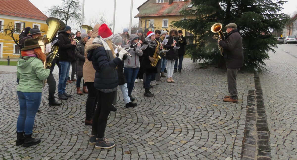 Danach ging es in zwei Gruppen durch die Marktgemeinde. An zehn Plätzen schallten dann die Weihnachtslieder durch den Ort und kündeten von der Geburt Jesu. Beim Erklingen der ersten Töne kamen viele Menschen aus den Häusern, um sich auf den Abend einstimmen zu lassen. Der Lohn für die Musiker war viel Applaus und die guten Wünsche zu Weihnachten.