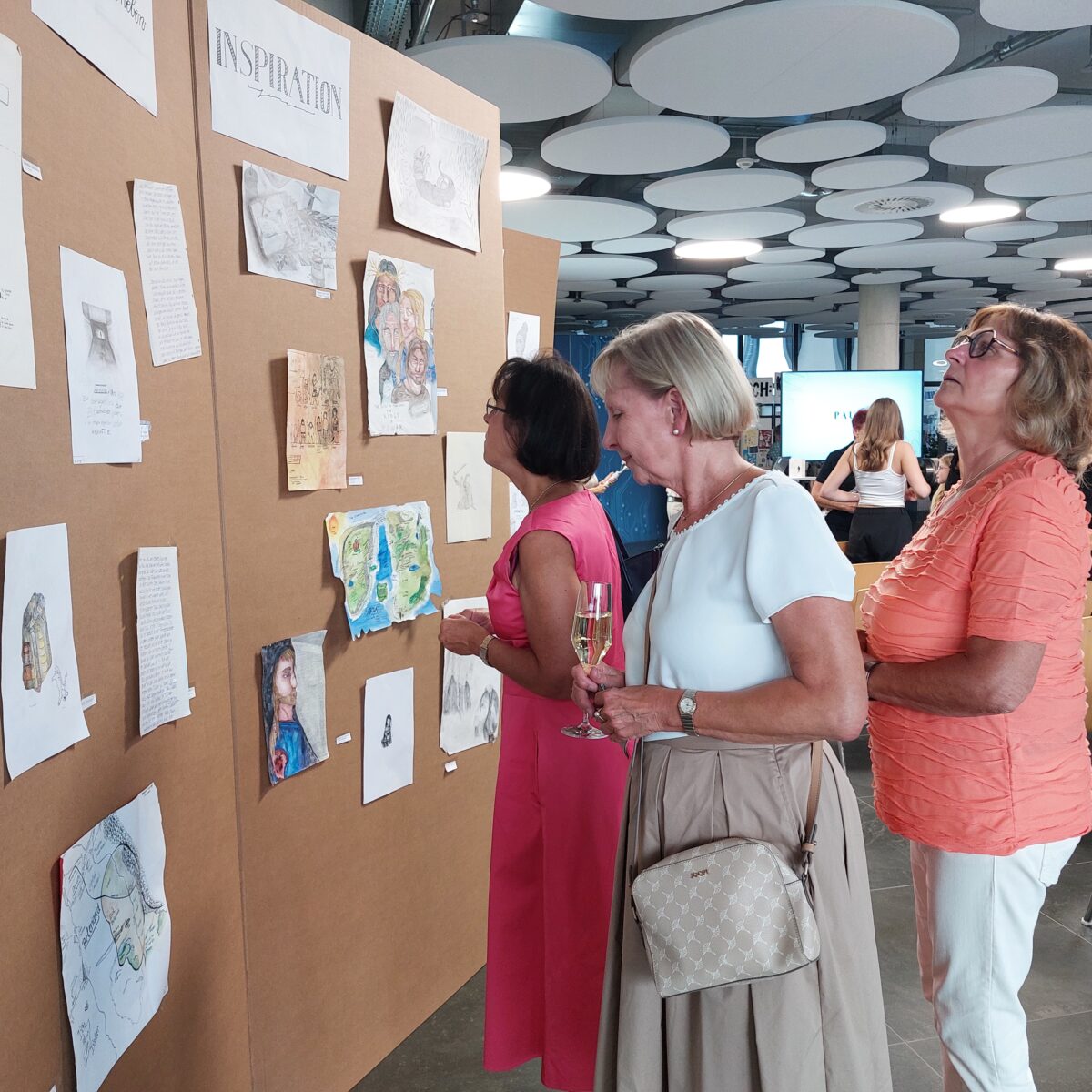 Viele zu Papier gebrachte Eindrücke, die auf die Autorin bei dem Schreiben ihrer Bücher eingeströmt sind, hatte sie anlässlich ihrer Lesung ins Lifecycle Building mitgebracht. An mehreren Ausstellungsflächen waren Werke aus ihrer Schulzeit und danach zu den Themen Mensch, Kunst oder Inspiration vor allem Zeichnungen zu betrachten. Die Ausstellung zeigte zahlreiche Werke, die die verschiedenen Schaffensphasen der Künstlerin und Autorin dokumentierten.