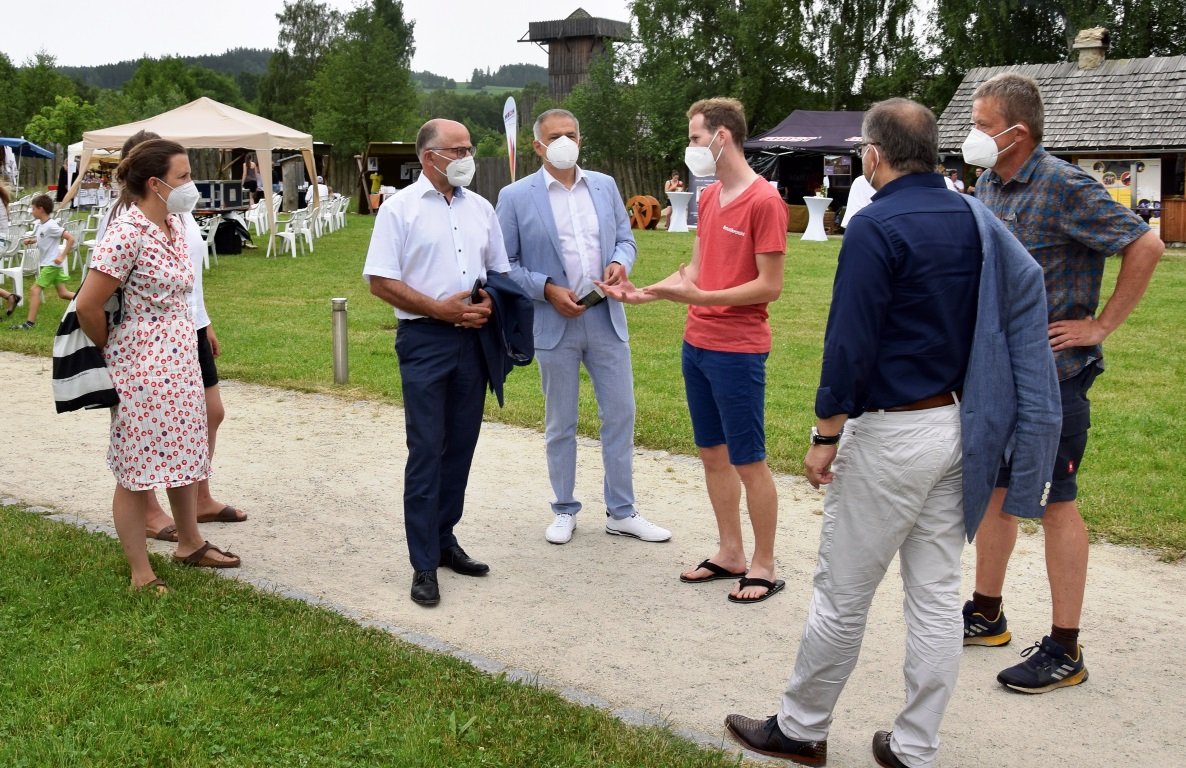 Der Organisator des Marktes, Alfred Wolf, führte den Tirschenreuther Landrat Roland Grillmeier in Begleitung des stellvertretenden Neustädter Landrats Albert Nickl, MdL Tobias Reiß´ und Kurt Hillingers vom Amt für Ländliche Entwicklung zur MiVoh-Bühne, wo Gilch die Arbeit der Musikinitiative beschrieb und die Bedeutung von junger, alternativer Kultur für die Region herausstellte.