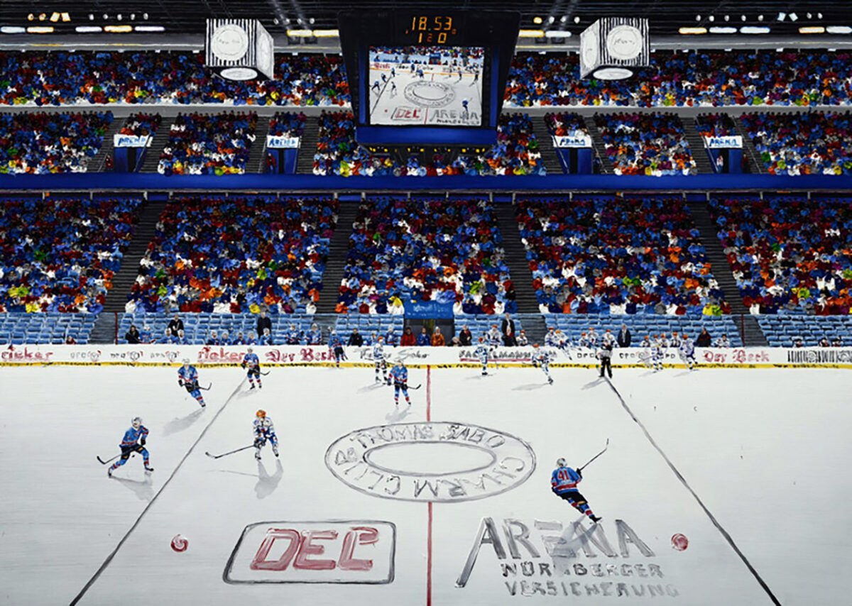Wer jetzt aber denkt, man könne Katharina Gierlach auf eine verträumte Landschaftsmalerei reduzieren, täuscht sich. In der Aula des Ortenburg-Gymnasiums in Oberviechtach hängt die schlachtenbummlerische Antithese: Das Sittengemälde der jüngeren Zeitgeschichte, ein Heimspiel des Clubs – aus der Zeit ihres Studiums an der Akademie der Bildenden Künste in Nürnberg. In ihrer Schule in Oberviechtach ist man ganz nah dran an den Ursprüngen ihrer Kunst: „Ich war hier in der Mädchen-Fußballmannschaft“, erzählt sie, „habe danach auch im Verein gespielt.“