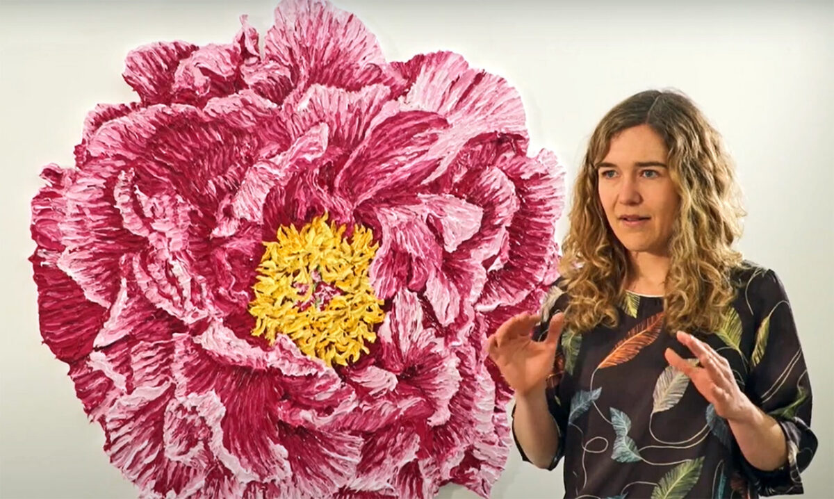 Aber nicht nur den Menschen gönnt sie im Sinn der Hippies neue Freiheiten, auch ihren Motiven: „Bei diesen Arbeiten ist neu, dass das Motiv den klassischen Keilrahmen verlässt und der Raum, in dem wir uns befinden, zum Bildraum wird.“ Wie Eisblumen an den Fensterscheiben wachsen ihre Blüten an den Wänden von Galerien und Museen. „Sie sind nicht an ein bestimmtes Format gebunden“, sagt sie, „ein Wunsch, den ich schon in meiner Kindheit hatte – etwas zu malen, das dann im Raum steht als Objekt.“