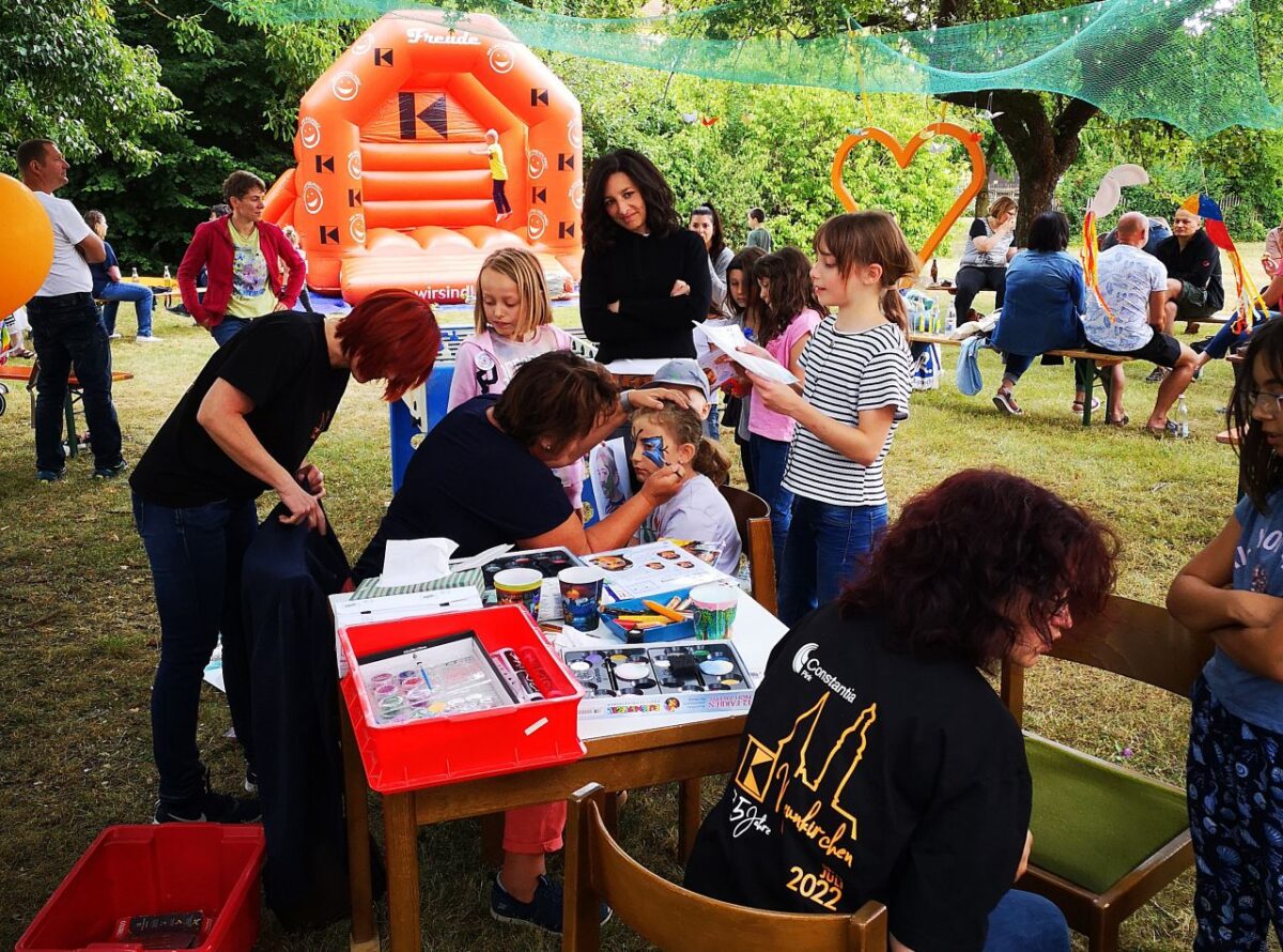 Egal ob mit Hüpfburg, selbst erstellten Buttons, Kicker, Riesenseifenblasen, verschiedenen Spielen oder in der Bastelecke – bei den kleinen und großen Teilnehmern kam zu keiner Zeit Langeweile auf. Ein Luftballonwettbewerb rundete das Angebot ab.