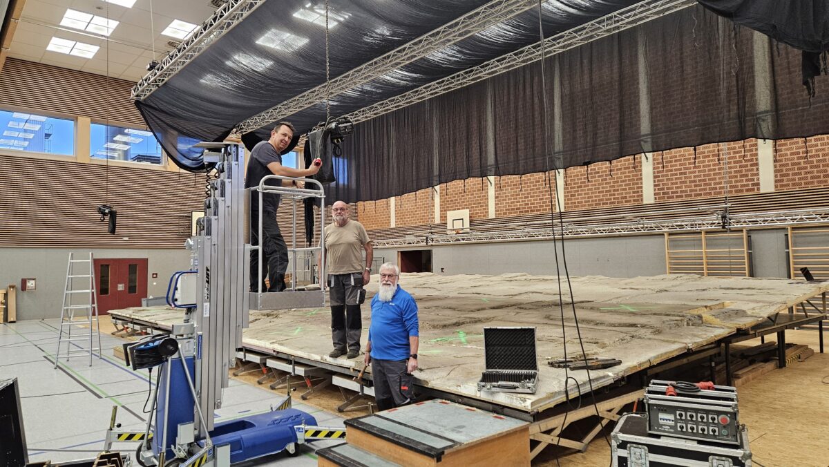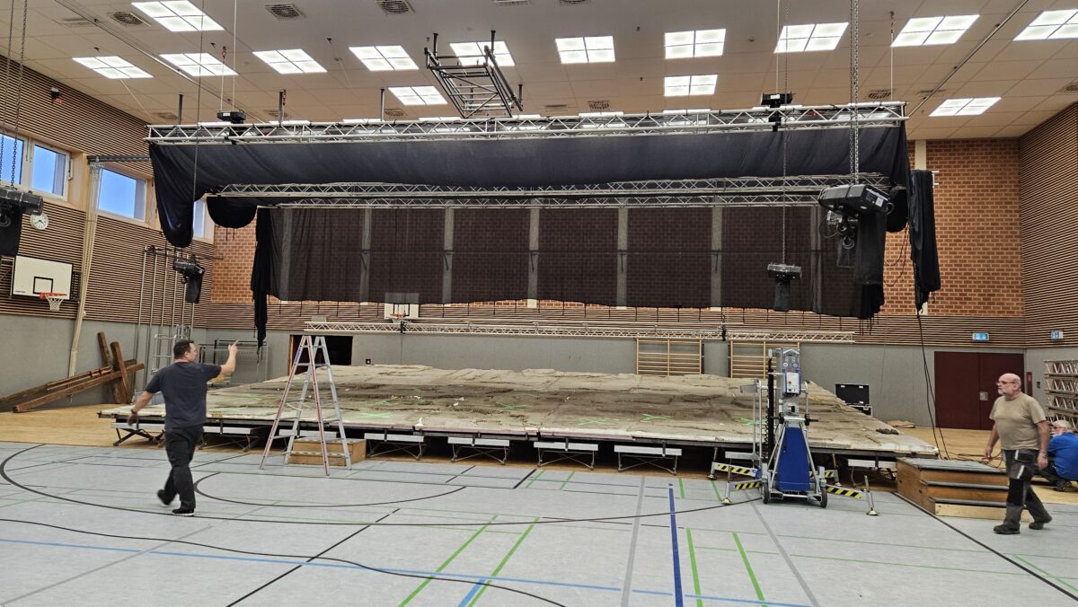 Nach dem Transport durch den Kemnather Bauhof, unter der Leitung von Peter Wolf und Michael Deubzer, werden nun die letzten Vorbereitungen getroffen, um die Bühne spielbereit zu machen – eine Aufgabe, für die echte Bühnenprofis wie Sebastian Burger und Manuel Besinger zuständig sind.