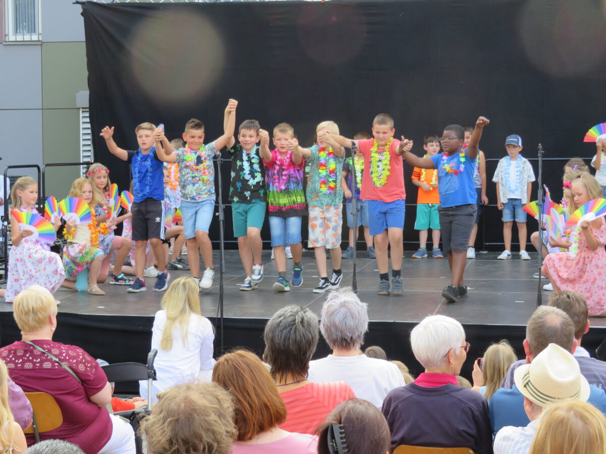 Weiter führte der Weg nach London und in die Karibik. Landestypische Kostüme und die jeweilige Musik wie „Waka Waka“, „Yellow Submarin“ oder „Somewhere over the Rainbow“ unterstrichen den Flair der Reise. Dann ging es zurück nach Hause. Mit dem Song „We are the World“ verabschiedeten sich die Kinder vom Publikum.