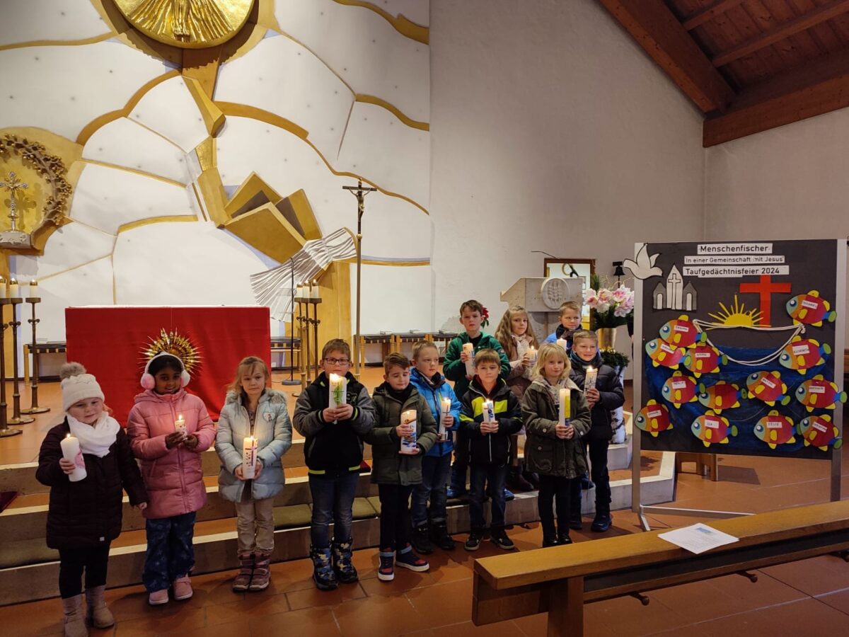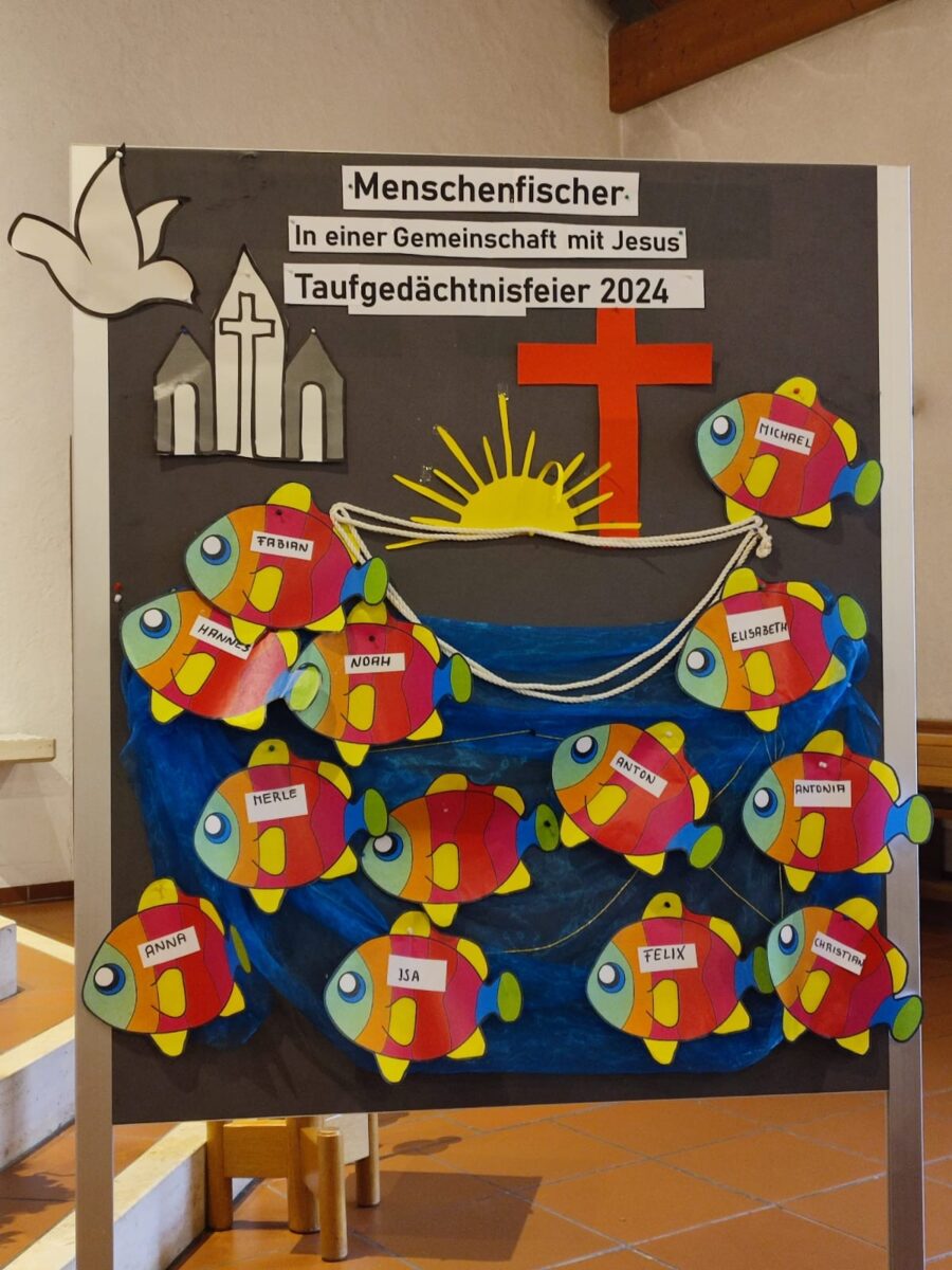 Jesus sei das Auge, jeder habe seinen Platz in der großen Gemeinschaft. Den „großen, starken Fisch der Christen“ können andere nicht so leicht angreifen. Gebastelte Fische mit den Namen der Kinder wurden an eine Wand am Altar geheftet.