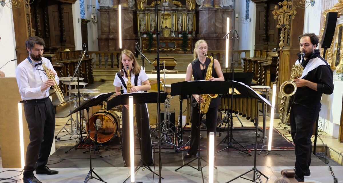 Transformation und Plattform nannte der Kulturpublizist Frank Piontek vor dem Beginn des Konzerts in Speinshart mit dem Arcis Saxophon Quartett und dem rhythmischen Genie des Perkussionisten Christian Benning dieses spezielle Format: Ein schräges Experiment in einer ungewöhnlichen Zusammensetzung der Instrumente, bei der jazziger Bläserklang einen wahren Sommersturm entfachte und eine Symphonie pochender Schlagwerkzeuge durch das barocke Gotteshaus rauschte.
