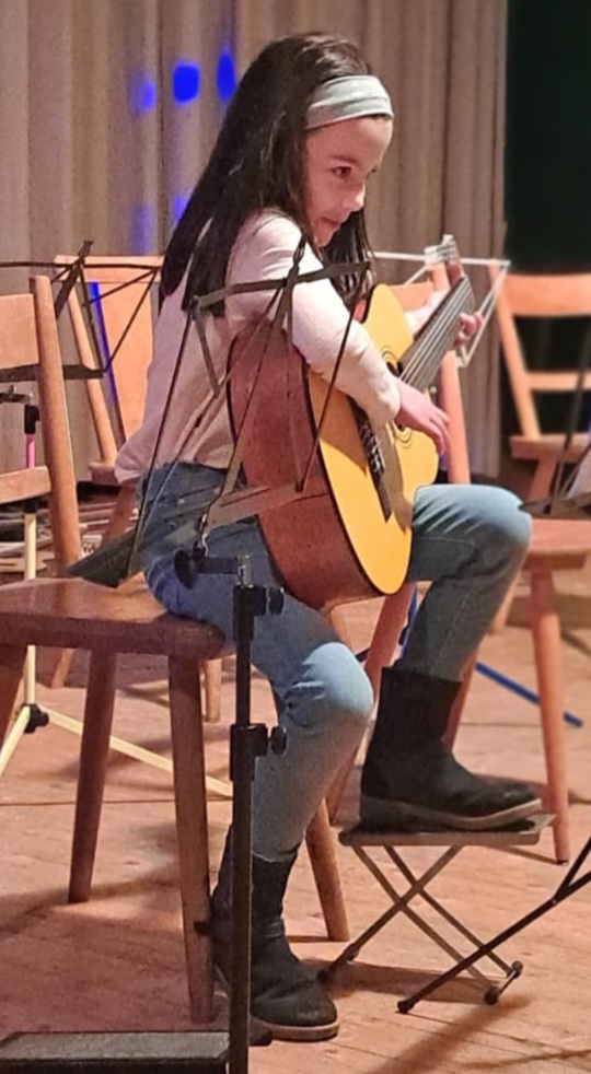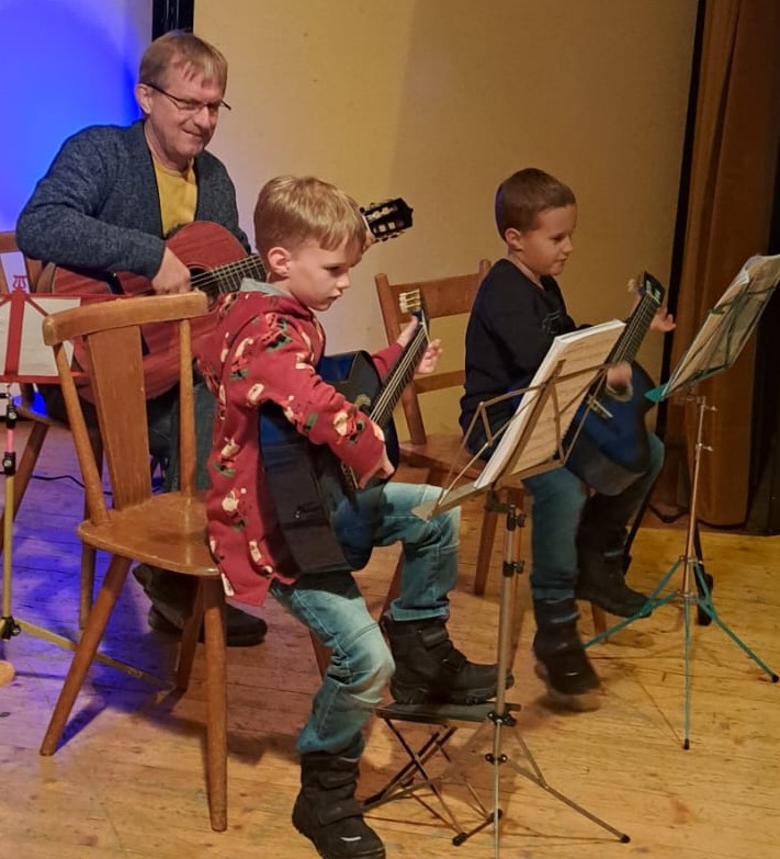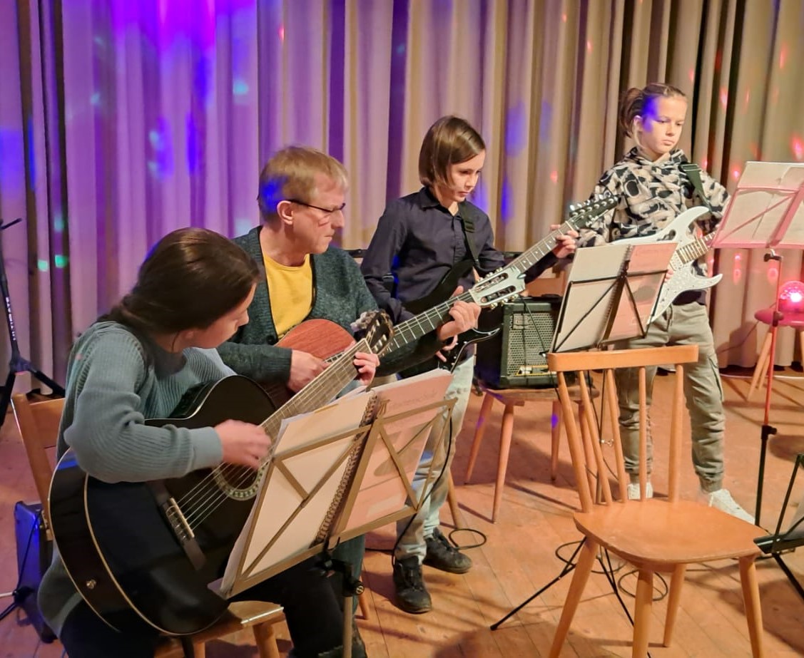 Zum Abschluss griffen E-Gitarrenschüler in die Saiten und gaben „Rudolph – The Red Nose Raindeer“ und „Feliz Navidad“ zu Besten. Englhart bedankte sich bei Pfarrer Daniel Fenk für das Überlassen des großen Saals des Jugendheims und bei den Eltern für das Unterstützen der Kinder und die Fahrten zum Unterricht. Anschließend stand man noch bei einem Getränk und Snacks zusammen und ließ den Abend ausklingen.