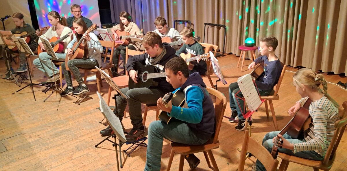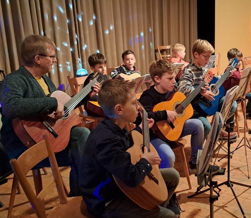 Kinder, die erst seit acht Wochen den Unterricht besuchen, konnten stolz schon ein erstes Weihnachtslied auf der Gitarre präsentieren. Die versierten Trompeter, ließen im Sextett das Repertoire erschallen, während auch die Gitarrenschüler in kleinen Gruppen bis zum Dezett traditionelle Weihnachts- und Winterlieder erklingen ließen.