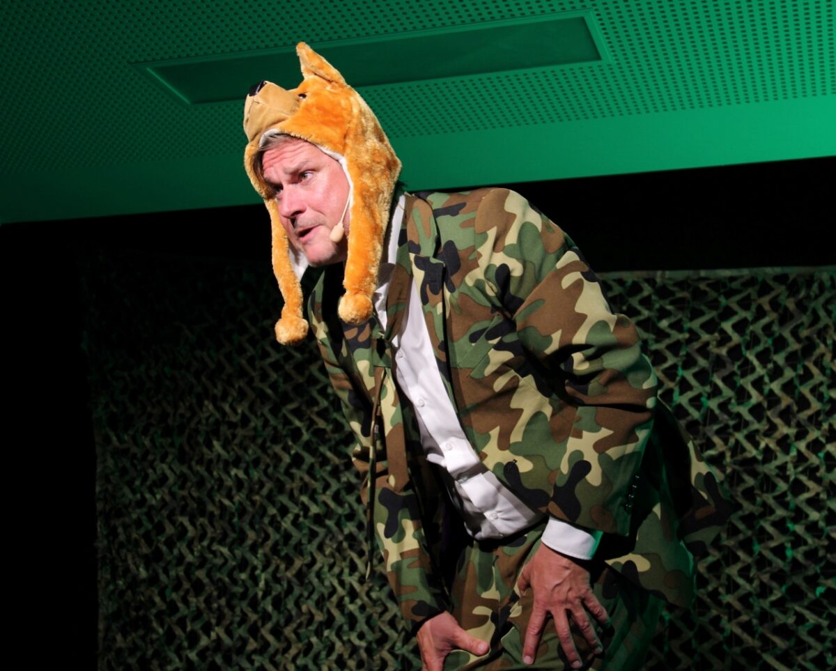 Er machte sich mit drei höchst unterschiedlichen Zeitgenossen auf zu dem 48-stündigen Trip durch die unendlichen Wälder zwischen den alten und neuen Bundesländern. Die Leitung hatte Afghanistan-Veteranen Uwe. Seine gespaltene Persönlichkeit zwischen faschistoidem Gehabe und traumatisiertem Kriegsheimkehrer führte den Kabarettisten zielsicher zur kritischen Bewertung der weltweit tobenden Kriege.