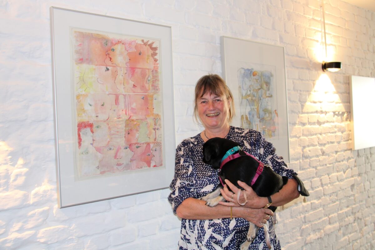 Die Ausstellung trägt den Titel „1000 Menschen und ein Mops“. „Entstanden ist die Idee an einer alten Druckmaschine meines Mannes Michael“, erklärt die Künstlerin. Beim Säubern der Walzen werden diese ausgerollt, auf Papier bleiben Flecken und Strukturen zurück. Diese farbigen Strukturen waren der Ausgangspunkt für ihre neue Bilderserie, die während der Corona-Pandemie im letzten Jahr entstanden ist.