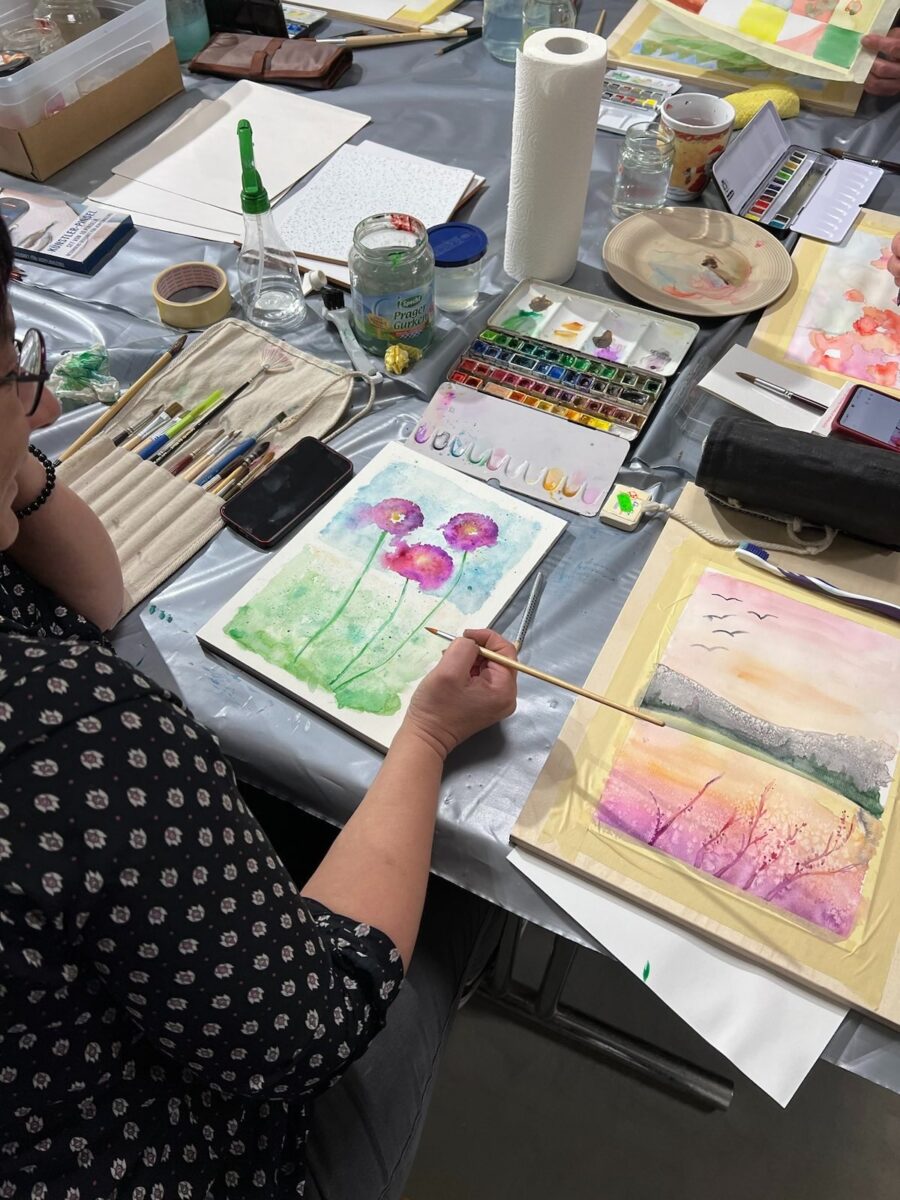 Auch beim Aquarellieren konnte die Teilnehmerinnen verschiedene Nass- in Nass-Techniken ausprobieren und umsetzen. Große Freude machte es den Künstlerinnen, florale und landschaftliche Aquarelle zu zaubern. Dass man in solch kurzer Zeit so viele schöne Werke erschaffen kann, erstaunte selbst Kursleiter Frischholz.
