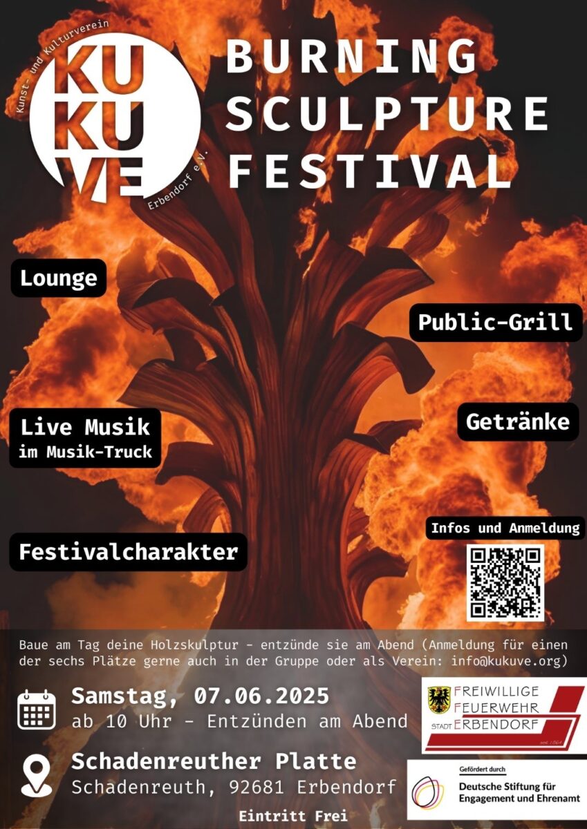 Am Samstag, 7. Juni, wird die Schadenreuther Platte in Erbendorf zum Schauplatz eines außergewöhnlichen Festivals. Unter dem Titel “Burning Sculpture Festival” lädt der Kunst- und Kulturverein Erbendorf e. V. (KUKUVE) zu einem Tag voller Kunst, Kreativität, Musik und Gemeinschaft ein – gekrönt von einem spektakulären Feuer-Ritual.