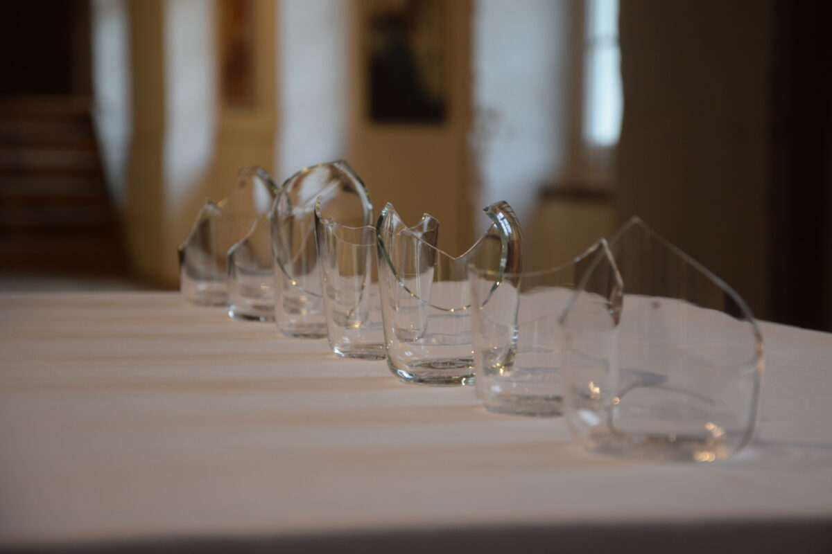 „Bruchwelle“ heißt die Glasarbeit von Louise Lang aus Gleißenberg. Sie hat ihr Studium an der HBK Braunschweig abgeschlossen und noch eine Lehre als Glasmacherin an der Glasfachschule in Zwiesel absolviert. Bei der Herstellung von Gläsern gibt es immer auch Fehler und Brüche. Damit arbeitet Lang dann weiter. So ist beispielsweise auch die siebenteilige Werkgruppe aus ofengeblasenem Glas entstanden.