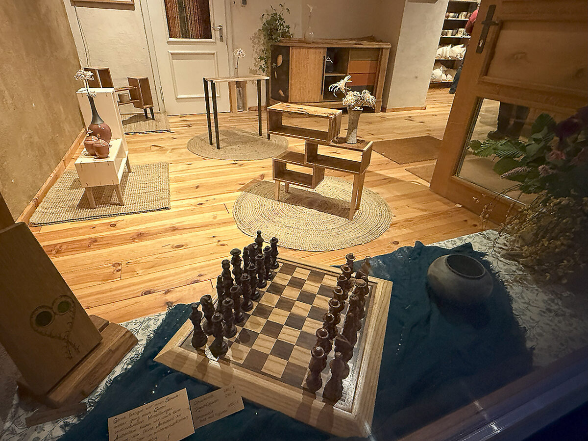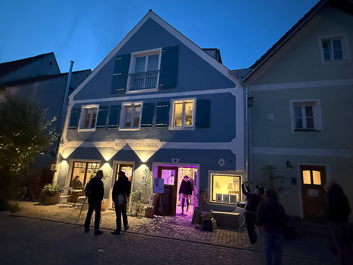 Bei der Abschlussnacht der KunstSchauNacht 2025 ist dieser Geist spürbar: Flaneure drängen sich in engen Fluren aneinander vorbei, lassen sich von versteckten Hinterhöfen verzaubern, treten in lichtdurchflutete Ateliers, versinken in sinistren Kellergewölben oder wälzen sich knarzende Holzstufen hinauf. Ein wenig neidisch treten sie in magische Gärten, in denen nur das sanfte Rauschen der Naab als Begleitmusik zu hören ist und in denen eine Bewohnerin ihre Skizzenbücher füllt – mitten im historischen Herzen Kallmünz’.