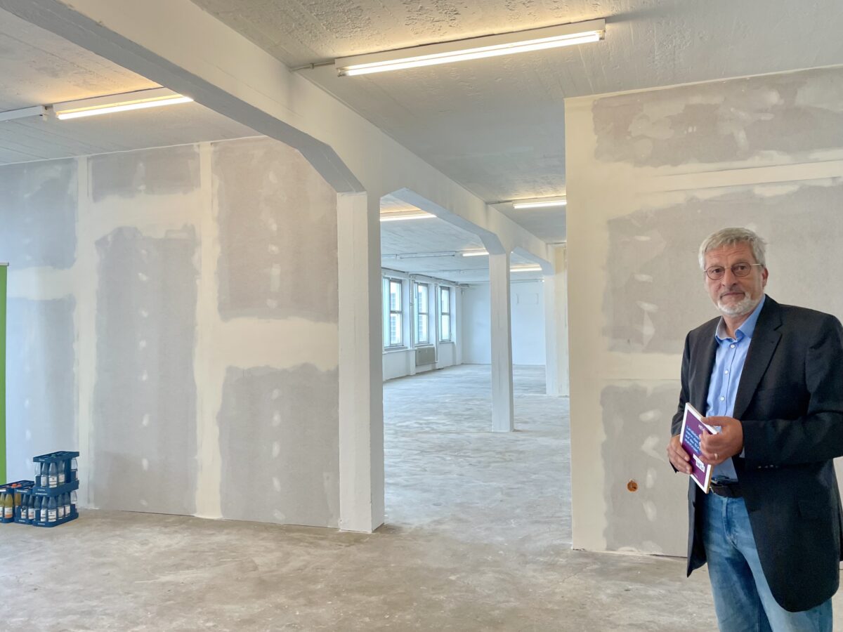 Noch braucht es etwas Fantasie. Geschäftsführer Wolfgang Meidenbauer und Adrian Wenck (Leitung Öffentlichkeitsarbeit) gewähren einen Blick in die ehemalige Fabrik. Der aktuelle Stand: Die großzügigen Räume sind blitzblank und getüncht, Elektrik und Leitungen erneuert. Die 700 angemieteten Quadratmeter sind bereit für den Einzug der Schauspieler-Truppe.