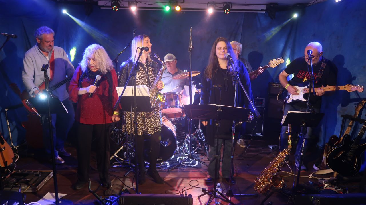 Ihr abwechslungsreicher und temperamentvoller Sound ging in Herz und Beine. Umgesetzt wurde die Party von den Rythmboys Herbert Müller (Bass) und Jockel Ruckriegel (Schlagzeug). Als Druckverstärker wirkten die beiden Ladies Britta Bader (Saxophon, Gitarre) und Margit Ochs (Gesang) sowie die beiden “Unzertrennlichen” Andreas Backhaus (Gitrre, Harp) und Mitch Meßner (Gitarre).