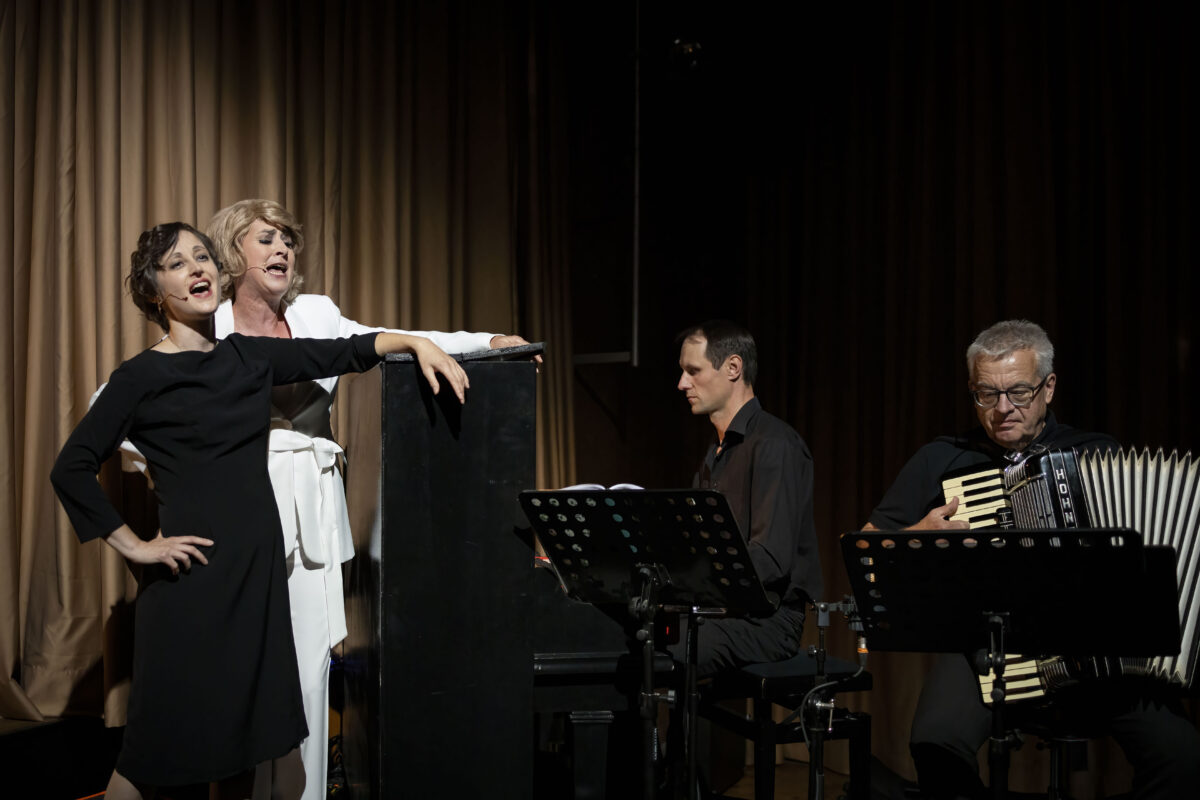 In kurzen Szenen wird die Freundschaft der beiden Sängerinnen erzählt, meist durch eine Einleitung der beiden sich dezent im Hintergrund haltenden Mitspieler Johannes Lukas und Jens-Ulrich Seffen zeitlich verortet. Die beiden übernehmen aber auch andere Rollen: Manager, Ehemänner, Krankenpfleger – aber trotz weniger Kostümwechsel sind die Szenen- und Zeitsprünge jederzeit nachvollziehbar. Durch die sensible Begleitung der beiden Musiker (Musikalischer Leiter Thomas Basy am Klavier und Michael Bertelshofer am Akkordeon) werden die grandiosen Hauptdarstellerinnen Claudia Lohmann (Marlene Dietrich) und Mica Bara (Édith Piaf) durchgehend getragen.