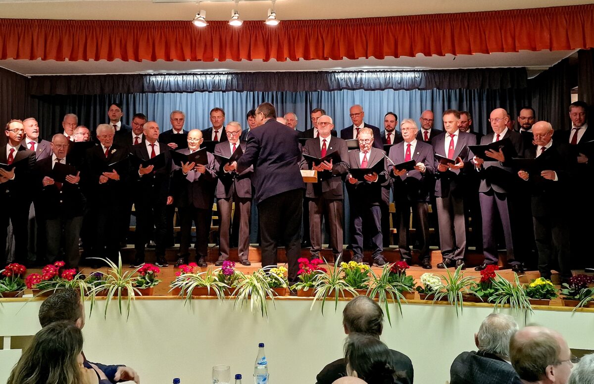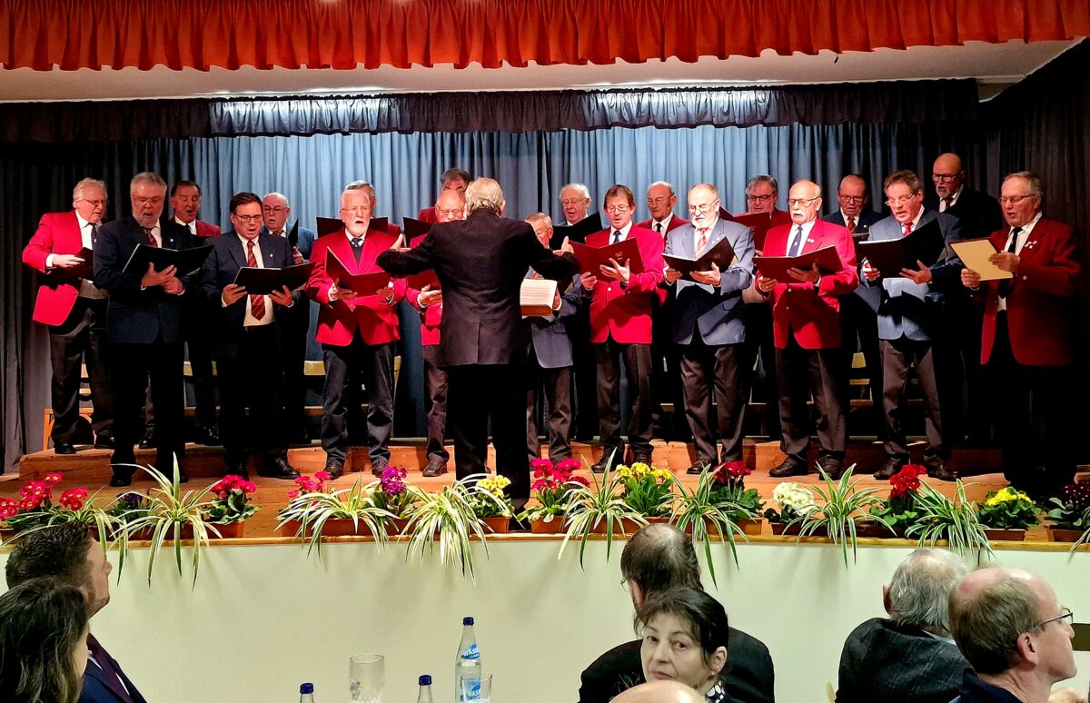 Glänzen konnten die Männer, die noch einmal auf die Bühne kamen mit dem Lied „Teure Heimat“, besser bekannt als Chorwerk aus der Oper Nabucco von Giuseppe Verdi. Auch „Weit, weit weg“ im Dialekt gesungen fand entsprechenden Beifall. In einem „Epilog“ reimte Horst Maschke, ein Sangesbruder aus dem Jubelverein, gekonnt. Die Chronik, im Vierzeiler aufgeschrieben, handelte von der Gründung über die schwierige Zeit nach den vierziger Jahren, den „Bunten Abenden“ und den runden Jubiläen bis heute mit den sangesbegeisterten Gleichgesinnten.