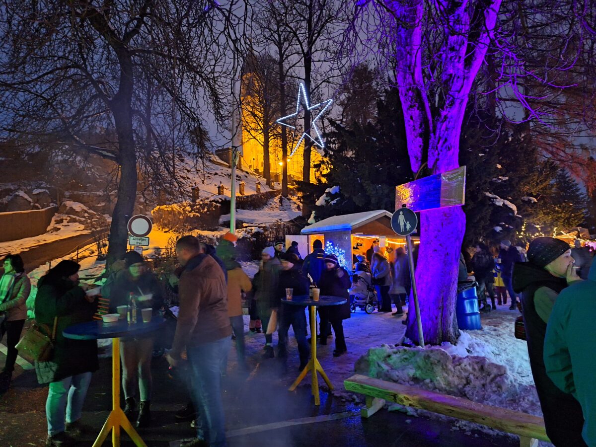 Der Stadtweiher war fast rundum mit einer Lichterkette eingerahmt, entlang des Ufers standen stählerne Behälter mit lodernden Holzkeilen, die Wärme und Licht verbreiteten. Die Stände von Vereinen und Organisationen boten in einer Art “Schmankerlgasse” Deftiges und Leckereien in jeder Geschmacksrichtung. Dazu fehlten natürlich auch die richtigen Getränke nicht.