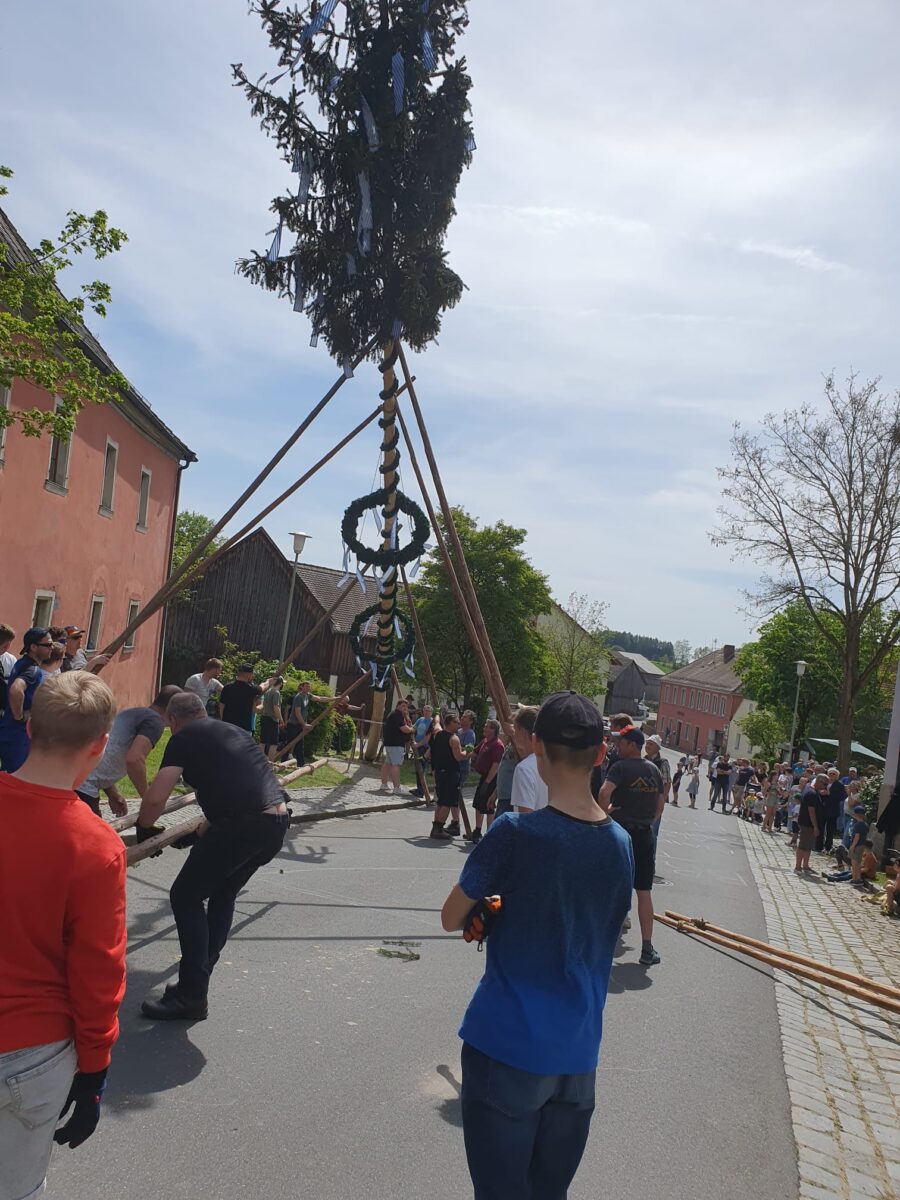 Maibaum traditionell mit Muskelkraft aufgestellt