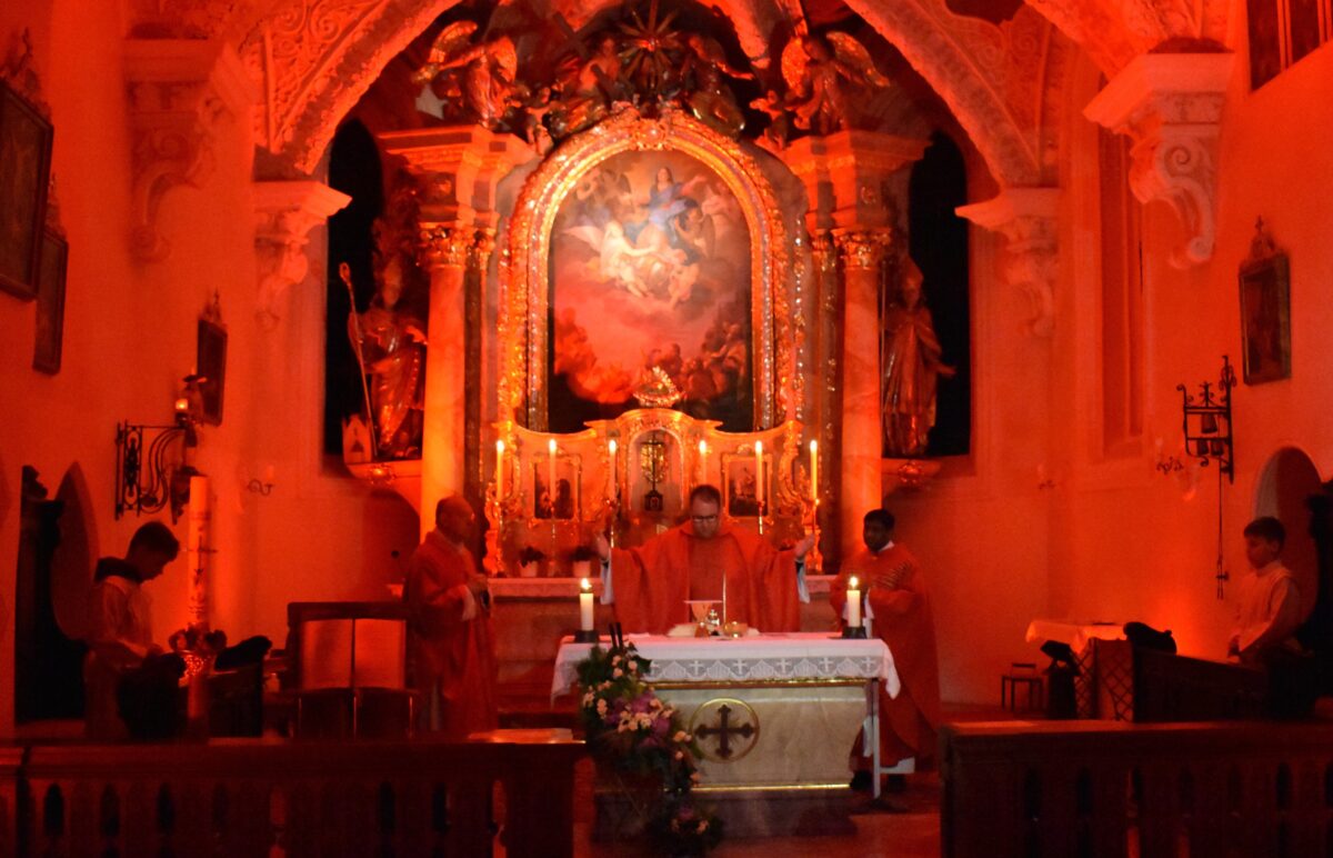Mariä-Himmelfahrtskirche blutrot angestrahlt