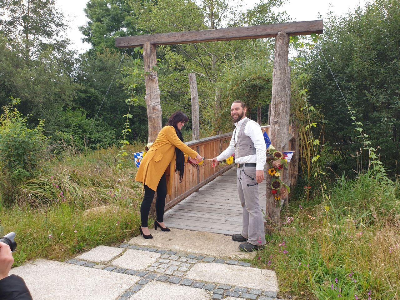 Dann kam der große Moment: Lächelnd durchschnitten die beiden Projektleiter Kateřina Zajíčková (Revis) und Michael Winkler (Via Carolina – Goldene Straße e.V.) das breite Blumenband mit zwei Gartenscheren.